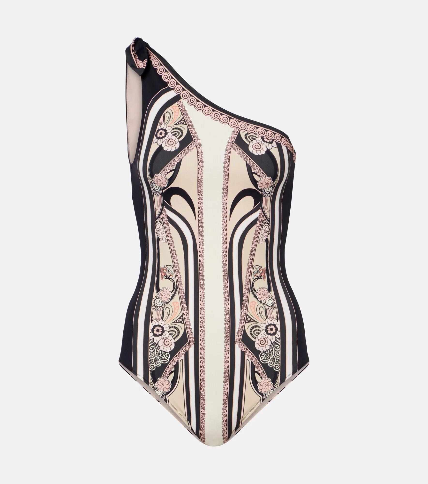 La DoubleJ works with top Milanese textile manufacturers to bring archival patterns to life on its signature eclectic styles. Printed with a vibrant motif, the Goddess swimsuit is a one-shoulder style. Product Details - Material: 74% polyamide, 26% elastane - Care instructions: hand wash - Made in Italy - Color: black - Designer color name: Ambrosia Placee - Closure: self-ties - Item number: P01166231 Size & Fit - True to size - Unpadded Top - Medium-cut leg - The model seen in the picture is 178cm-5'10", cup size B, and wearing a size XS