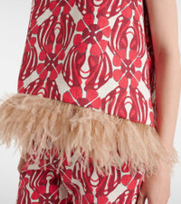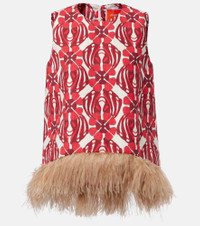 Product Details - Material: 98% cotton, 2% elastane - Care instructions: dry clean - Made in Italy - Designer color name: Clover - Item color: red - Lining: 100% polyester - Trim: 100% ostrich feathers - Contains non-textile parts of animal origin - Item number: P01051932 Size & Fit - True to size - Designed for a loose fit - Non-stretchy fabric - Falls to the hip - The model seen in the picture is 178cm-5'10" and wearing a size XS