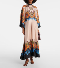 La DoubleJ works with top Milanese textile manufacturers to bring archival patterns to life, as seen in the Magnifico maxi dress. Its silk workmanship features a bouquet of flowers, while the silhouette is defined by flared sleeves and a high neckline. Product Details - Material: 100% silk - Care instructions: dry clean - Made in Italy - Designer color name: Bounty Placee - Item color: pink, black, multicolor - Self-tie neck - Pockets: side slit pockets - Item number: P01084453 Size & Fit - True to size - Cinched waist - Non-stretchy fabric - The model seen in the picture is 178cm-5'10" and wearing a size XS