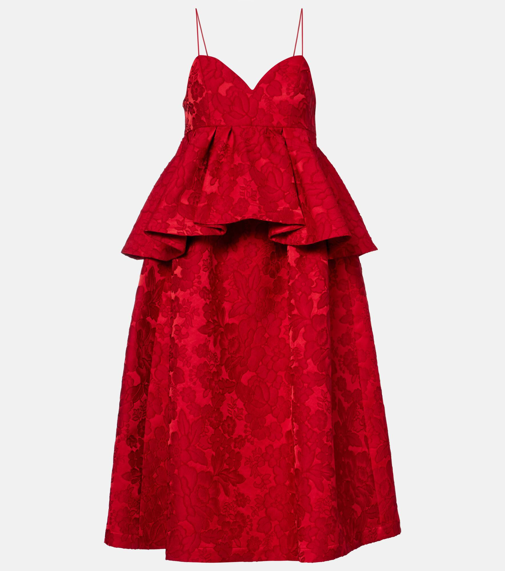 La DoubleJ works with top Milanese textile manufacturers to bring archival patterns to life on its signature eclectic styles. Made from exquisite matelasse jacquard, the Satine midi dress is complete with thin shoulder straps and peplum detailing. Product Details - Material: 97% polyester, 3% polyamide - Care instructions: dry clean - Made in Italy - Designer color name: Peony - Item color: red - Lining: 100% polyester - Closure: zipped side, self-ties - Item number: P01051931 Size & Fit - True to size - Low back - Cinched waist - Non-stretchy fabric - The model seen in the picture is 178cm-5'10" and wearing a size XS
