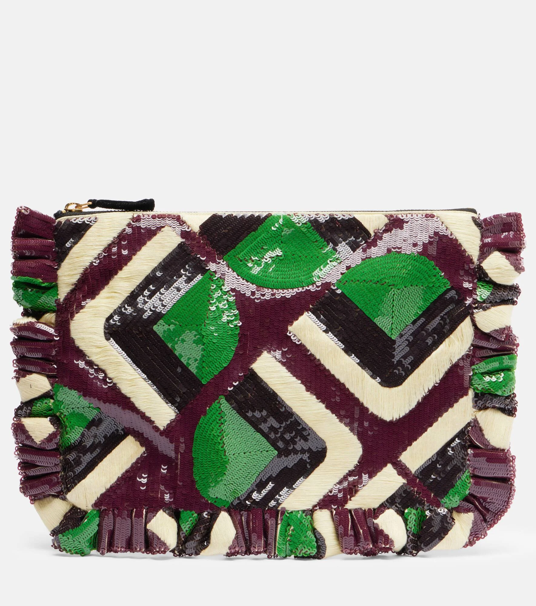 La DoubleJ works with top Milanese textile manufacturers to bring archival patterns to life on its signature eclectic styles. This clutch boasts all-over sequins and a spacious silhouette for your daily essentials. Product Details - Material: viscose, polyester - Lining: fabric - Made in India - Color: multicoloured - Designer color name: Domino Paillettes - Trim: sequins, silk - Internal details: single compartment - Closure: zipped top - Includes: dust bag - Item number: P01129949 Size & Fit - Height 24/21cm-9.5/8.5" - Width 36/29cm-14/11.5"