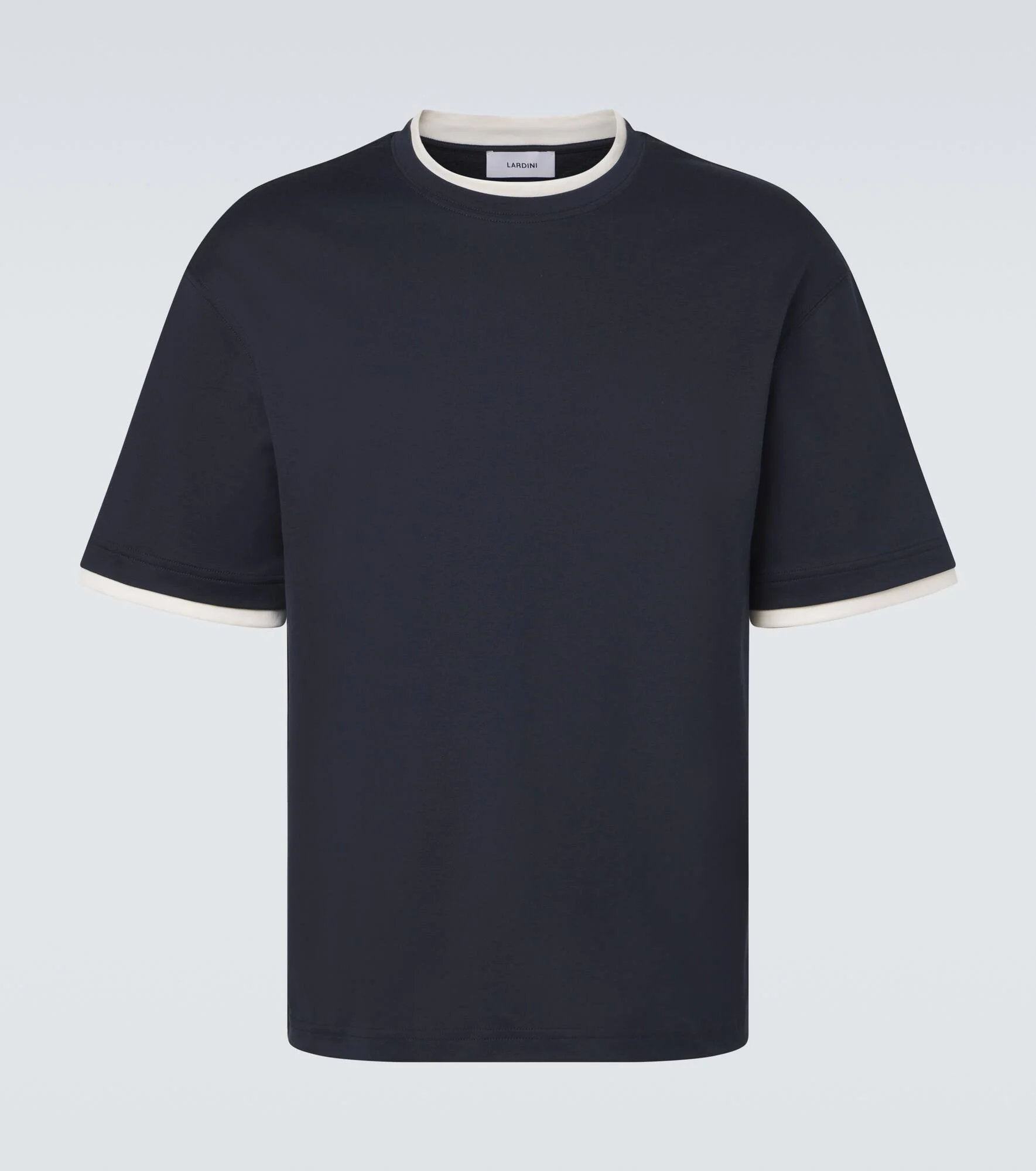 A family-owned business with a legacy of Italian-made tailoring, Lardini unceasingly strives to bring together tradition and innovation. This T-shirt is made in Italy from pure cotton with contrast-trims. Product Details - Material: 100% cotton - Care instructions: dry clean - Made in Italy - Color: blue - Designer color name: Navy - Item number: P01136473 Size & Fit - True to size - Dropped shoulders - Straight fit - Non-stretchy fabric - Falls to the hip - Height of model is 189cm-74.5" and wears a size L