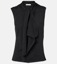 Designed to transcend seasons and trends, Lemaire's styles strike the perfect balance between quality and functionality. This asymmetric vest is crafted from a wool blend and is complete with a tie-neck detail. Product Details - Material: 50% acrylic, 50% wool - Care instructions: hand wash - Made in Portugal - Designer color name: Antracite - Item color: gray - Self-tie collar - Closure: buttoned front - Item number: P01089301 Size & Fit - True to size - Cinched waist - Slightly stretchy fabric - Falls to the hip - The model seen in the picture is 178cm-5'10" and wearing a size XS