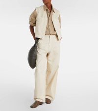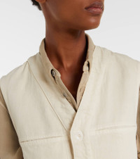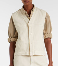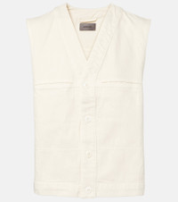 Designed to transcend seasons and trends, Lemaire's styles strike the perfect balance between quality and functionality. This vest is made from cotton for a loose fit and features front buttoned closure, along with multiple pockets to keep your essentials handy. Product Details - Material: 100% cotton - Care instructions: machine wash at 30 degrees - Made in Morocco - Designer color name: Denim Snow Clay - Item color: white - Lining: 100% cotton - Details: 100% cow leather - Contains non-textile parts of animal origin - Closure: buttoned front - Pockets: side slit pockets, breast pockets - Item number: P01089260 Size & Fit - True to size - Designed for a loose fit - Non-stretchy fabric - Falls to the hip - The model seen in the picture is 178cm-5'10" and wearing a size FR 34