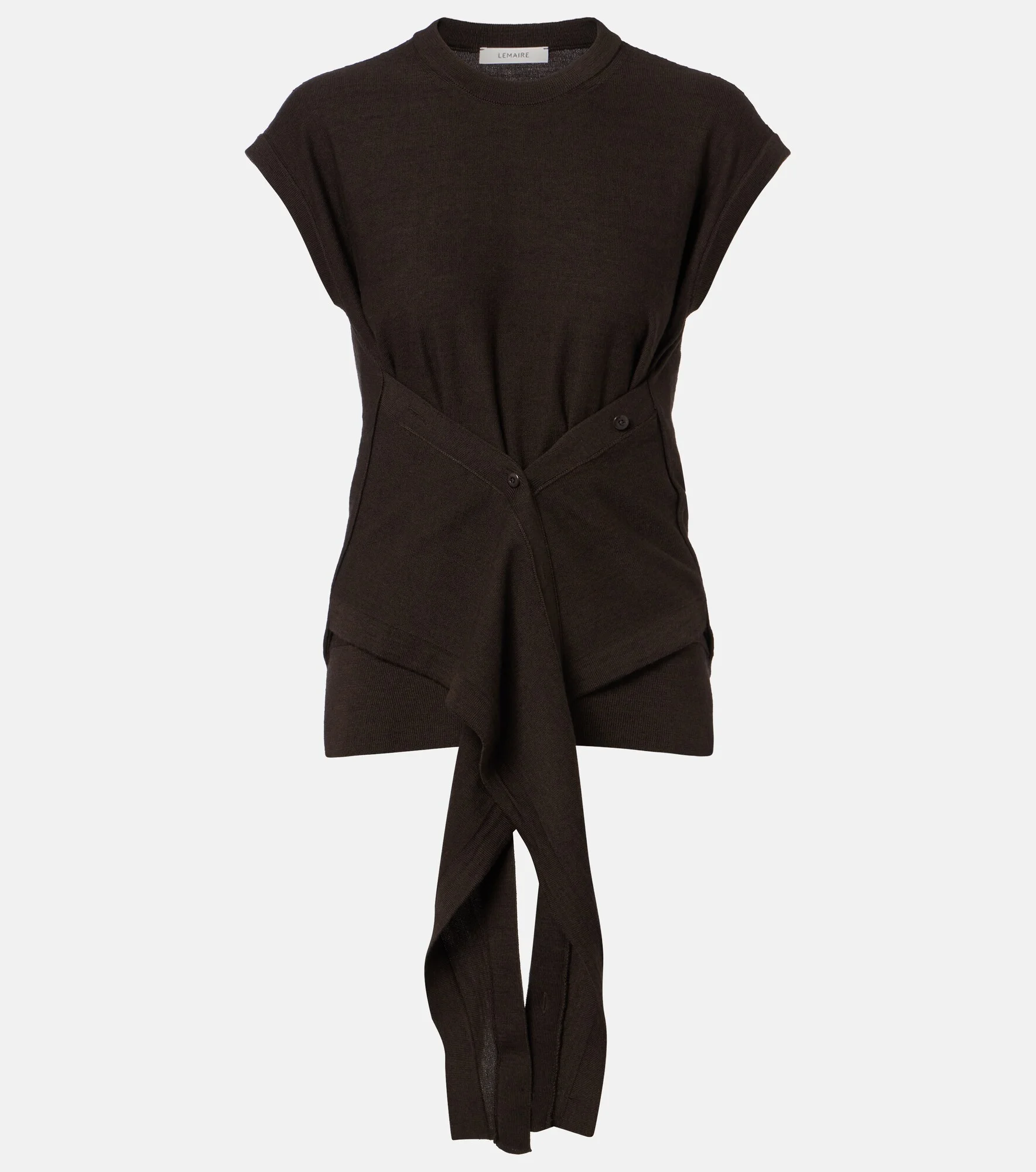 Designed to transcend seasons and trends, Lemaire's styles strike the perfect balance between quality and functionality. This top is knitted from a soft wool-blend and features side panels that can be adjusted with buttons to create striking layered volume. Product Details - Material: 50% acrylic, 50% wool - Care instructions: hand wash - Made in Portugal - Color: brown - Designer color name: Dark Cacao - Item number: P01138622 Size & Fit - True to size - Cinched waist - Adjustable at the waist - Slightly stretchy fabric - Falls to the hip - The model seen in the picture is 178cm-5'10" and wearing a size XS