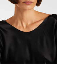 The Barb top from Leset is crafted from soft satin for a lightweight feel. The alluring design features an elegant boat neck, long sleeves, and a draped open back. Product Details - Material: 75% acetate, 25% polyester - Care instructions: dry clean - Made in the USA - Designer color name: Black - Item color: black - Item number: P01096571 Size & Fit - True to size - Dropped shoulders - Low back - Designed for a loose fit - Non-stretchy fabric - Falls to the hip - The model seen in the picture is 178cm-5'10" and wearing a size XS