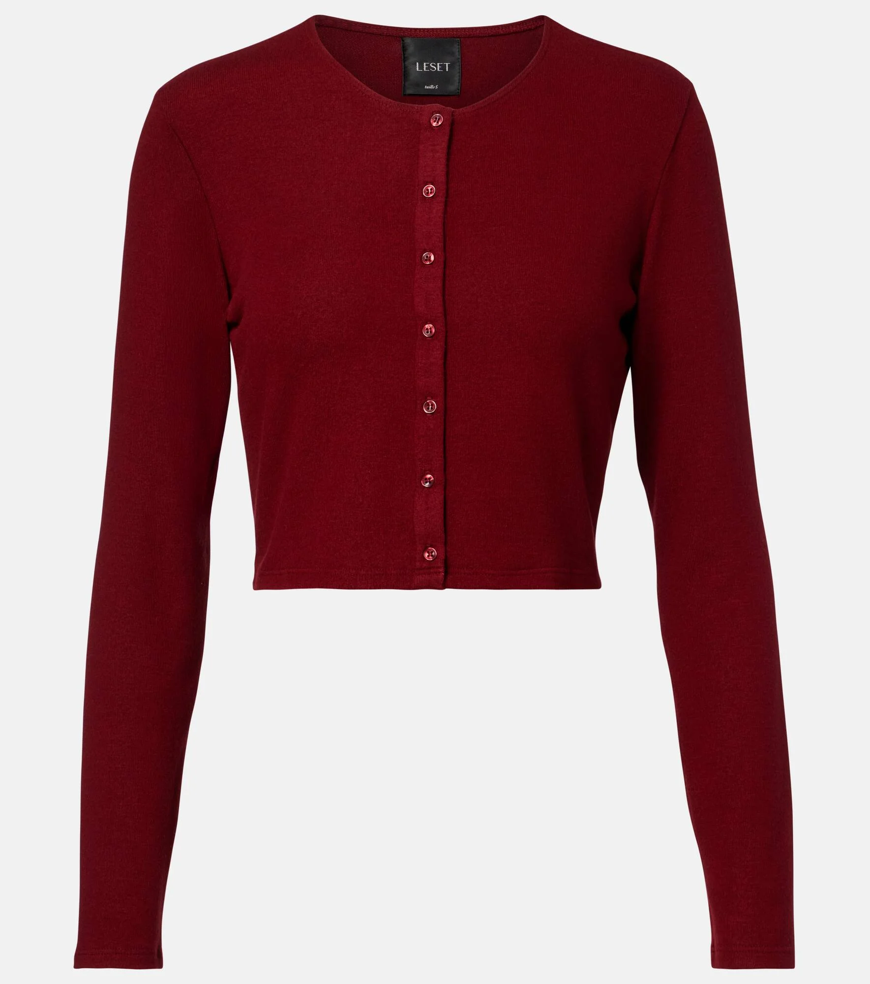 Update your everyday rotation with the Lauren cardigan from Leset. Crafted from brushed sweater jersey, the design is rendered in a deep burgundy hue and boasts a cropped, long-sleeved silhouette with buttoned front closure. Product Details - Material: 47% polyester, 47% rayon, 6% elastane - Care instructions: hand wash cold - Made in the USA - Color: burgundy - Designer color name: Pinot - Item color: burgundy - Closure: buttoned front - Item number: P01123141 Size & Fit - True to size - Straight fit - Stretchy fabric - Cropped - The model seen in the picture is 178cm-5'10" and wearing a size XS