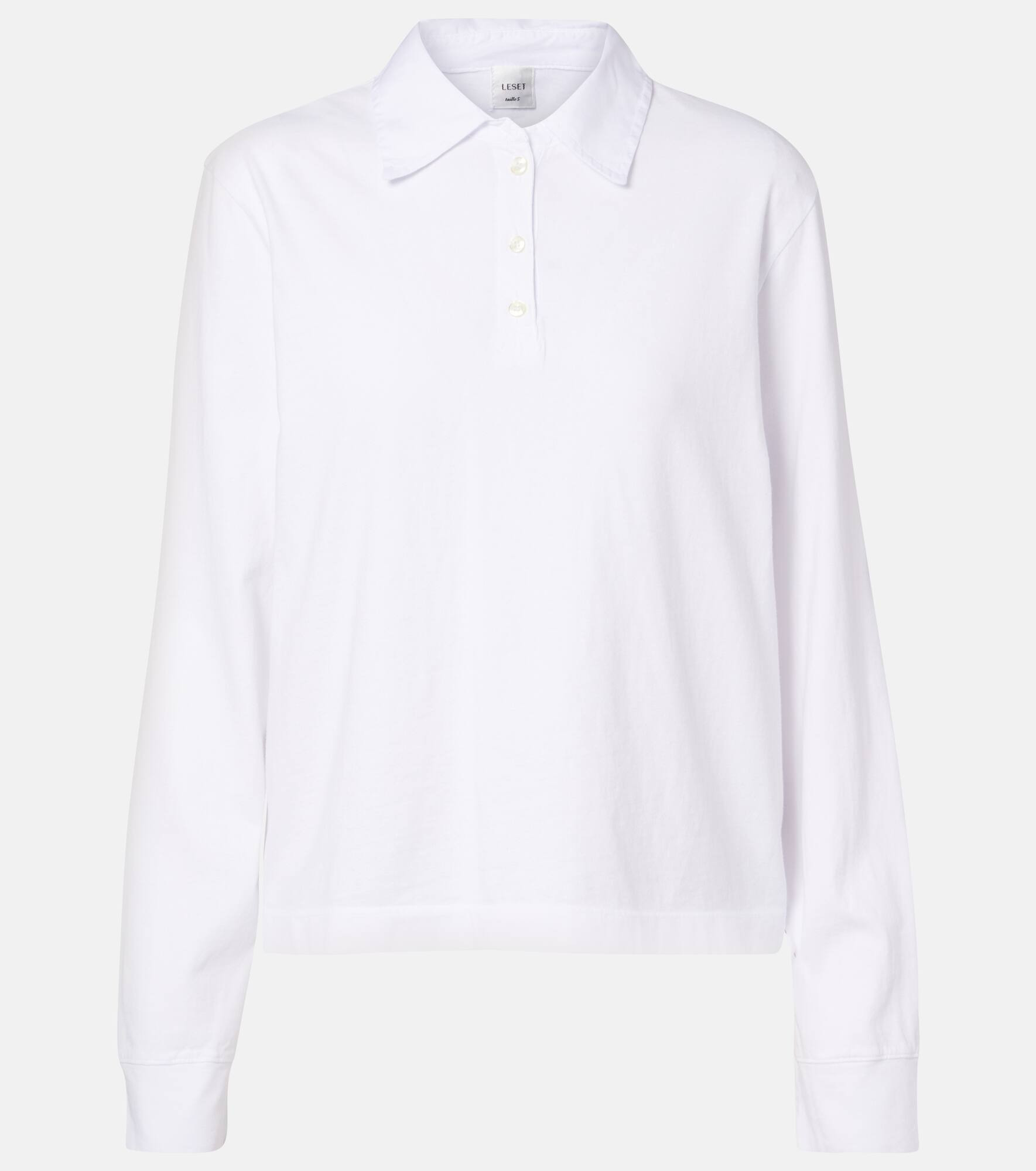 The most-loved style from Leset's collection of everyday essentials, the Margo is reimagined for colder days in this polo sweater iteration. Made from white cotton jersey, the piece features a pointed collar, Henley placket, and an oversized fit. Product Details - Material: 100% cotton - Care instructions: machine wash cold - Made in the USA - Designer color name: White - Item color: white - Collar: polo collar - Closure: buttoned placket - Side slits - Item number: P01096575 Size & Fit - True to size - Designed for a loose fit - Slightly stretchy fabric - Falls to the hip - The model seen in the picture is 178cm-5'10" and wearing a size XS