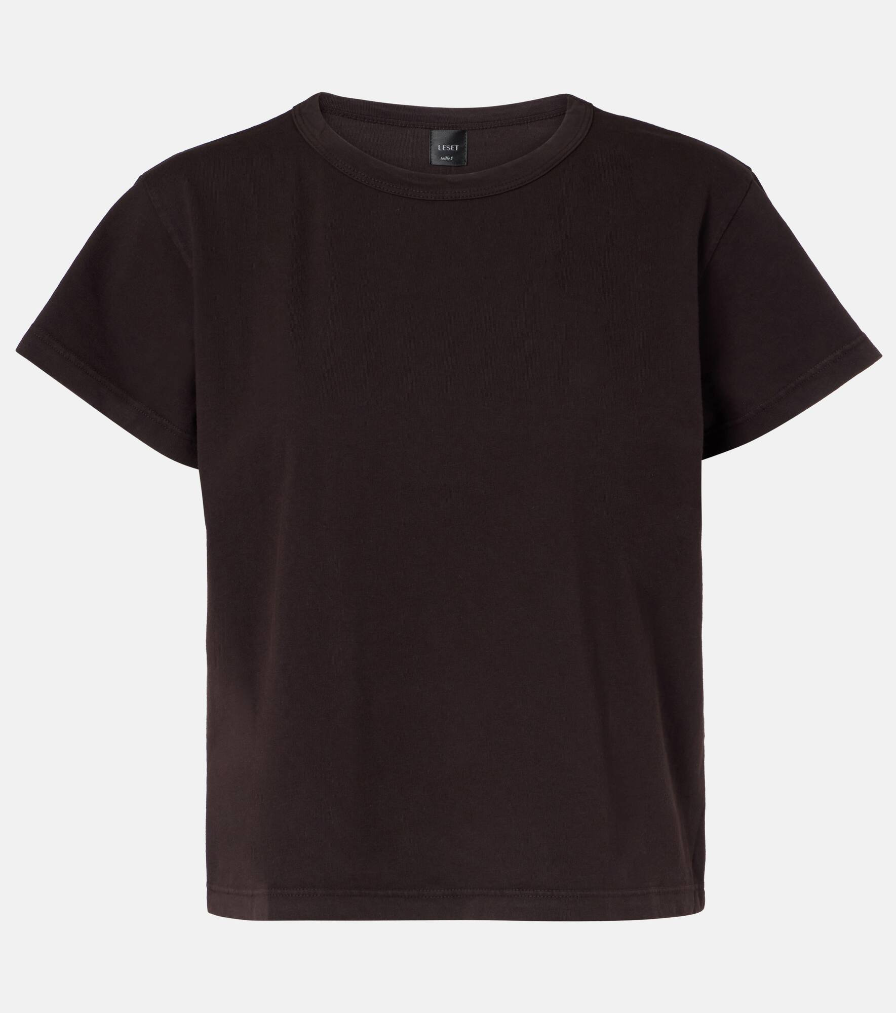The Margo is the most-loved T-shirt from Leset's collection of everyday essentials. Made from pure cotton jersey, the crewneck piece is subtly cropped and has a slightly boxy silhouette. Product Details - Material: 100% cotton - Care instructions: machine wash cold - Made in the USA - Designer color name: Choco - Item color: brown - Collar: crewneck - Item number: P01069315 Size & Fit - True to size - Straight fit - Slightly stretchy fabric - Falls to the hip - The model seen in the picture is 178cm-5'10" and wearing a size XS