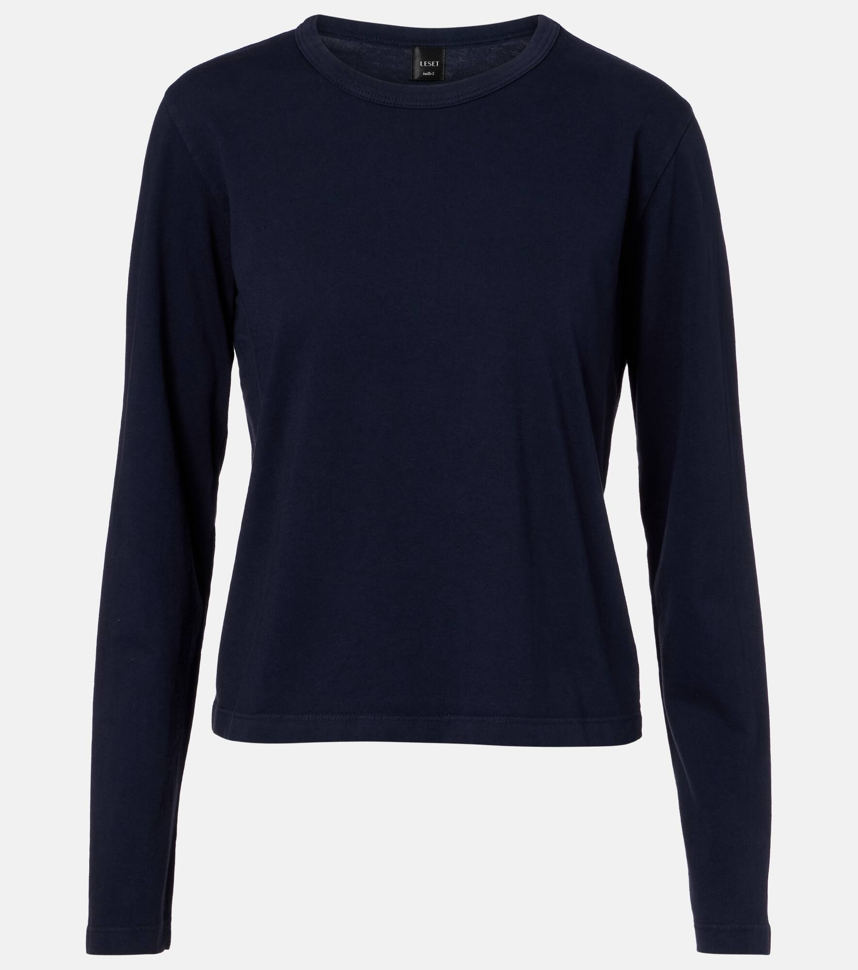 Leset reimagines a contemporary wardrobe with versatile, elevated basics and seasonal hero pieces designed for day-to-night transitions. Made from cotton jersey, the Margo T-shirt is a long-sleeved style with a subtle cropped silhouette. Product Details - Material: 100% cotton - Care instructions: machine wash cold - Made in the USA - Designer color name: Midnight - Item color: blue - Collar: crewneck - Item number: P01111985 Size & Fit - True to size - Straight fit - Slightly stretchy fabric - Falls to the hip - The model seen in the picture is 178cm-5'10" and wearing a size XS