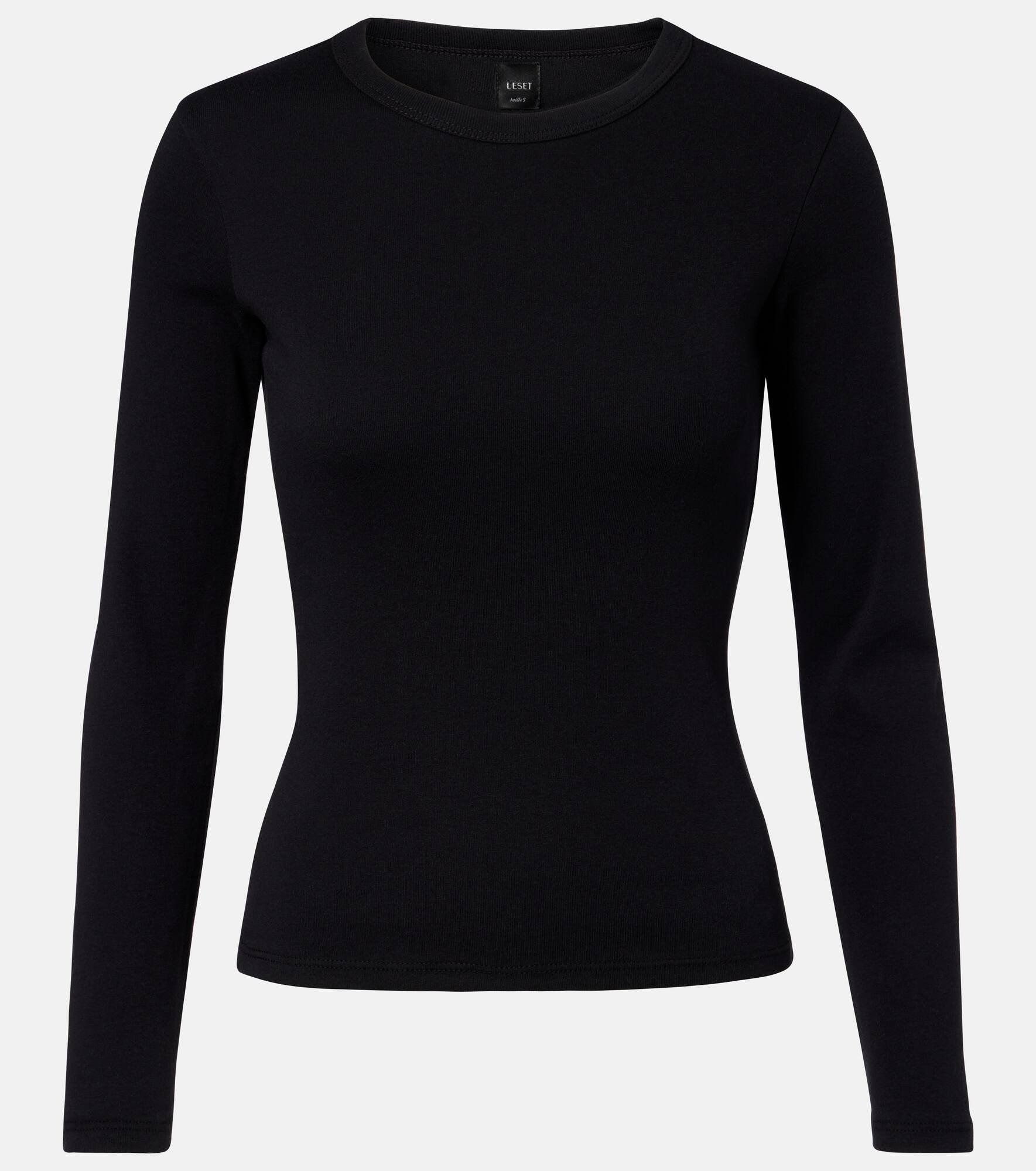A simple black T-shirt from Leset can introduce a lot of versatility to your daily edit. The Nando is a fitted, long-sleeved silhouette with a classic crew neckline and finely ribbed-knit cotton construction. Product Details - Material: 100% cotton - Care instructions: hand wash - Made in the USA - Designer color name: Black - Item color: black - Collar: crewneck - Item number: P01096577 Size & Fit - True to size - Fitted - Stretchy fabric - Falls to the hip - The model seen in the picture is 178cm-5'10" and wearing a size XS