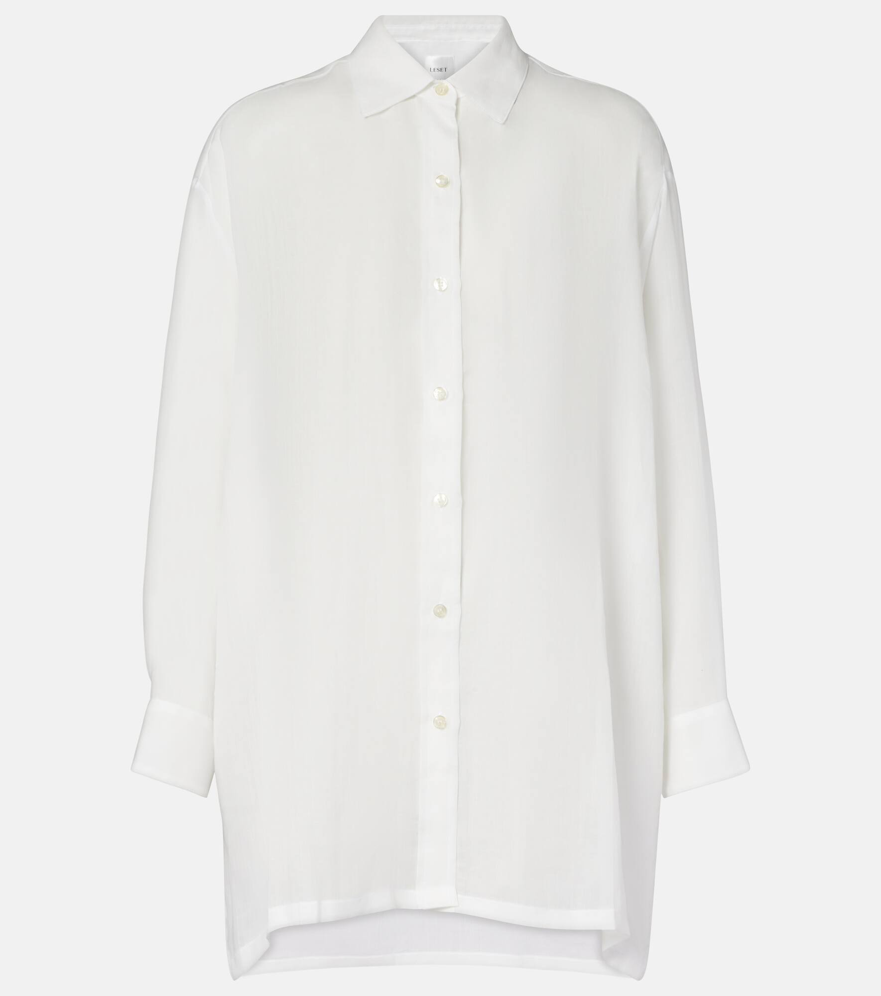 Crafted from lightweight ramie, the Niko shirt from Leset is cut to an effortless oversized silhouette. The design features dropped sleeves and an exposed button placket for a sleek finish. Product Details - Material: 100% ramie - Care instructions: dry clean - Made in the USA - Designer color name: Parchment - Item color: white - Collar: classic (Straight point) - Cuff: buttoned - Closure: buttoned front - Item number: P01069347 Size & Fit - Fits large to size - we recommend trying one size smaller - Dropped shoulders - Sheer - Oversized - Non-stretchy fabric - Falls below the hip - The model seen in the picture is 178cm-5'10" and wearing a size XS