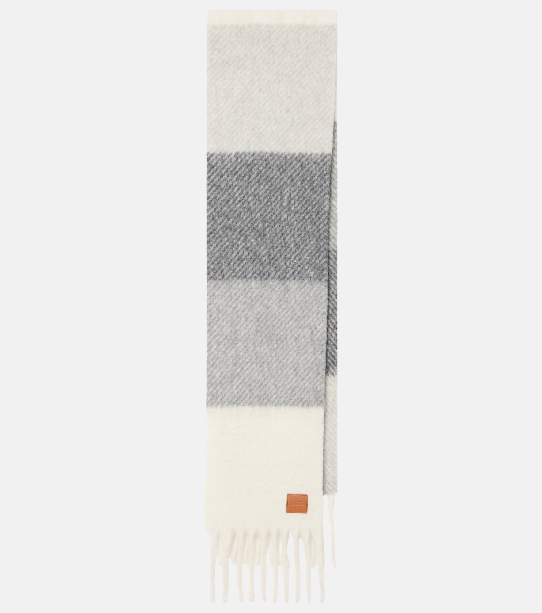 Wrap up cold days in this warm scarf from Loewe. This fringed piece is crafted in Italy from a bicolored alpaca and wool blend and showcases the designer's leather logo patch. Product Details - Material: 60% alpaca wool, 25% wool, 15% polyamide - Care instructions: dry clean - Made in Italy - Designer color name: Grey/White - Item color: gray, white - Contains non-textile parts of animal origin - Item number: P01065691 Size & Fit - Length 210cm-82.5" - Width 27cm-10.5" - Length of fringe 15cm-6"