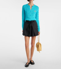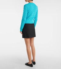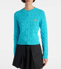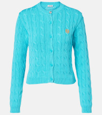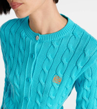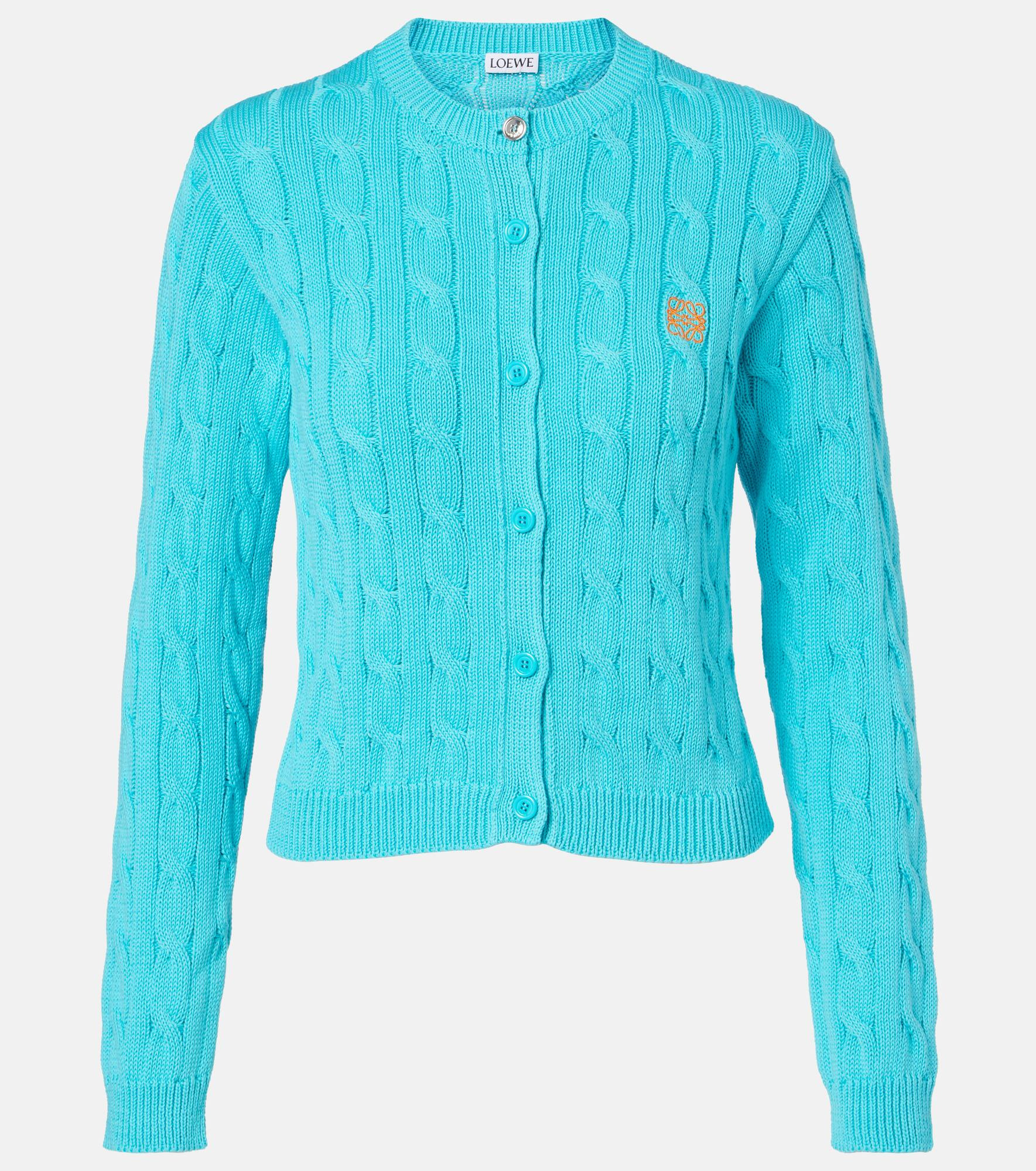 Expertly cable-knit from pure, lightweight cotton, this cardigan features signature emblem embroidery at the chest. The Anagram logo was designed by the Spanish artist Vicente Vela as a quadruple-L insignia that now lends instant recognition to any Loewe piece. Product Details - Material: 100% cotton - Care instructions: dry clean - Made in Italy - Designer color name: Turquoise - Item color: blue - Embroidery: 100% polyester - Closure: buttoned front - Hem: ribbed - Item number: P01066217 Size & Fit - True to size - Cinched waist - Slightly stretchy fabric - Slightly cropped - The model seen in the picture is 178cm-5'10" and wearing a size XS