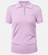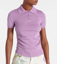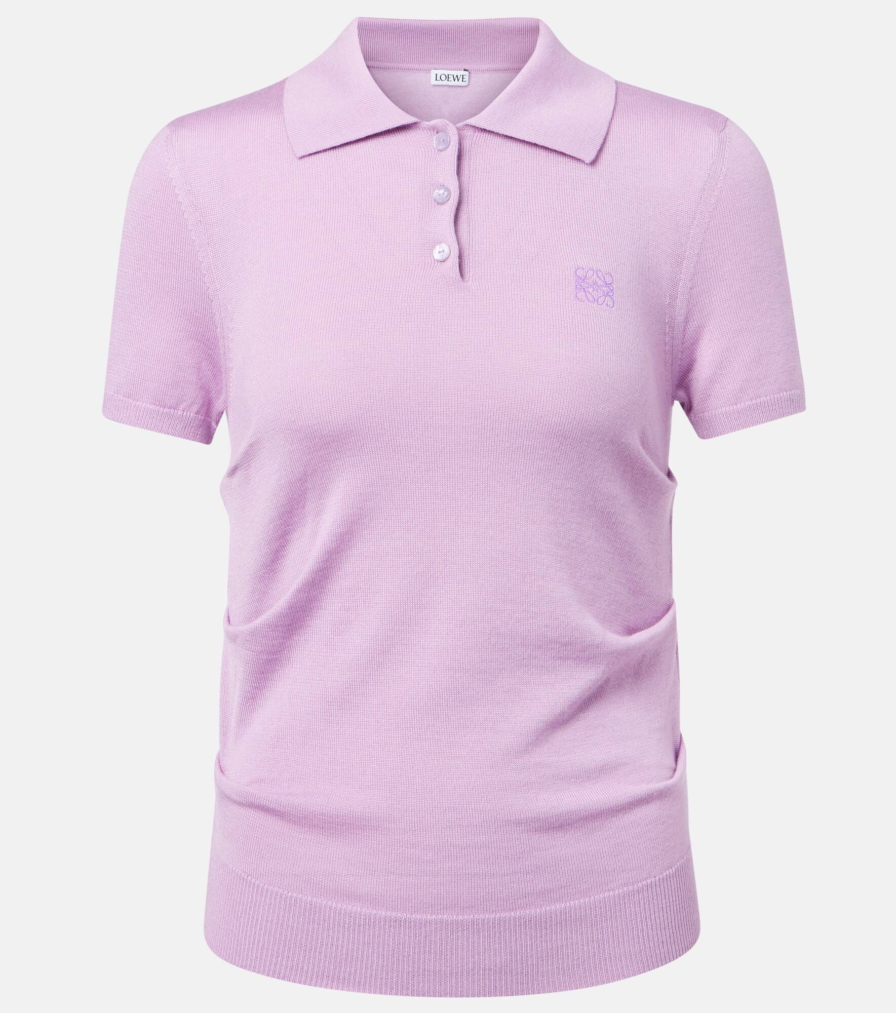 Crafted from ultra-soft cashmere and silk, this polo sweater from Loewe features short sleeves and the brand's iconic Anagram at the chest. The design is complete with a classic collar, partially buttoned front, and ribbed trims. Product Details - Material: 78% cashmere, 22% silk - Care instructions: dry clean - Made in Italy - Designer color name: Lilac - Item color: purple - Embroidery: 100% polyester - Closure: partially buttoned front - Contains non-textile parts of animal origin - Item number: P01066259 Size & Fit - True to size - Cinched waist - Stretchy fabric - Slightly cropped - The model seen in the picture is 178cm-5'10" and wearing a size XS