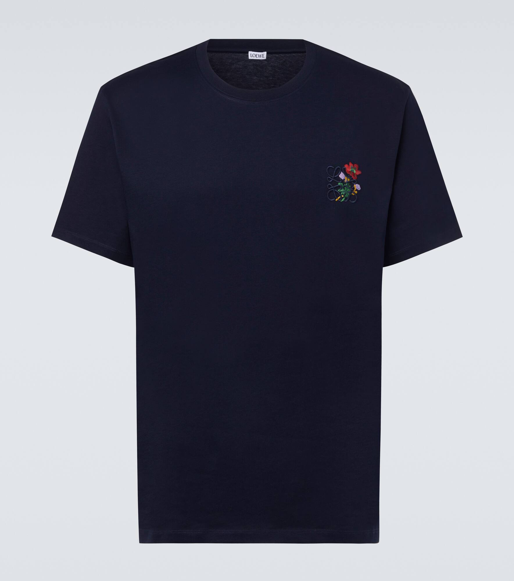 Embroidered with a floral iteration of the brand's signature motif, this T-shirt is crafted from pure cotton. The Anagram logo was designed by the Spanish artist Vicente Vela as a quadruple-L insignia that now lends instant recognition to any Loewe piece. Product Details - Material: 100% cotton - Care instructions: machine wash at 30 degrees - Made in Portugal - Designer color name: Dark Navy - Item color: blue - Trim: 99% cotton, 1% elastane - Embroidery: 100% polyester - Collar: crewneck - Item number: P01063177 Size & Fit - True to size - Designed for a loose fit - Slightly stretchy fabric - Falls below the hip - Height of model is 189cm-74.5" and wears a size L