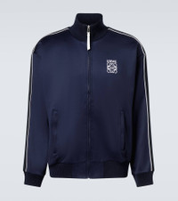Founded in 1846 as a leathermaking company, Loewe maintains a commitment to art and craft with the utmost quality. This track jacket is made from technical jersey and features striped detailing and the brand's signature Anagram embroidery. Product Details - Material: 56% polyamide, 44% cotton - Care instructions: machine wash at 30 degrees - Made in Portugal - Designer color name: Dark Navy - Item color: blue - Trim: 100% cotton - Details: 100% calf leather - Material II: 100% viscose - Embroidery: 100% polyester - Material III: 100% cotton - Lining: 100% polyamide - Pocket lining: 100% cotton - Contains non-textile parts of animal origin - Closure: zipped front - Pockets: zipped pockets - Collar: turtleneck - Cuff: ribbed - Hem: ribbed - Item number: P01063157 Size & Fit - True to size - Dropped shoulders - Designed for a loose fit - Elasticated hem - Non-stretchy fabric - Falls to the hip - Height of model is 189cm-74.5" and wears a size L