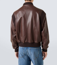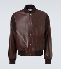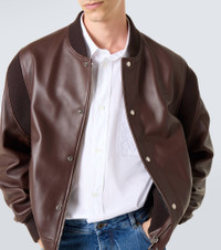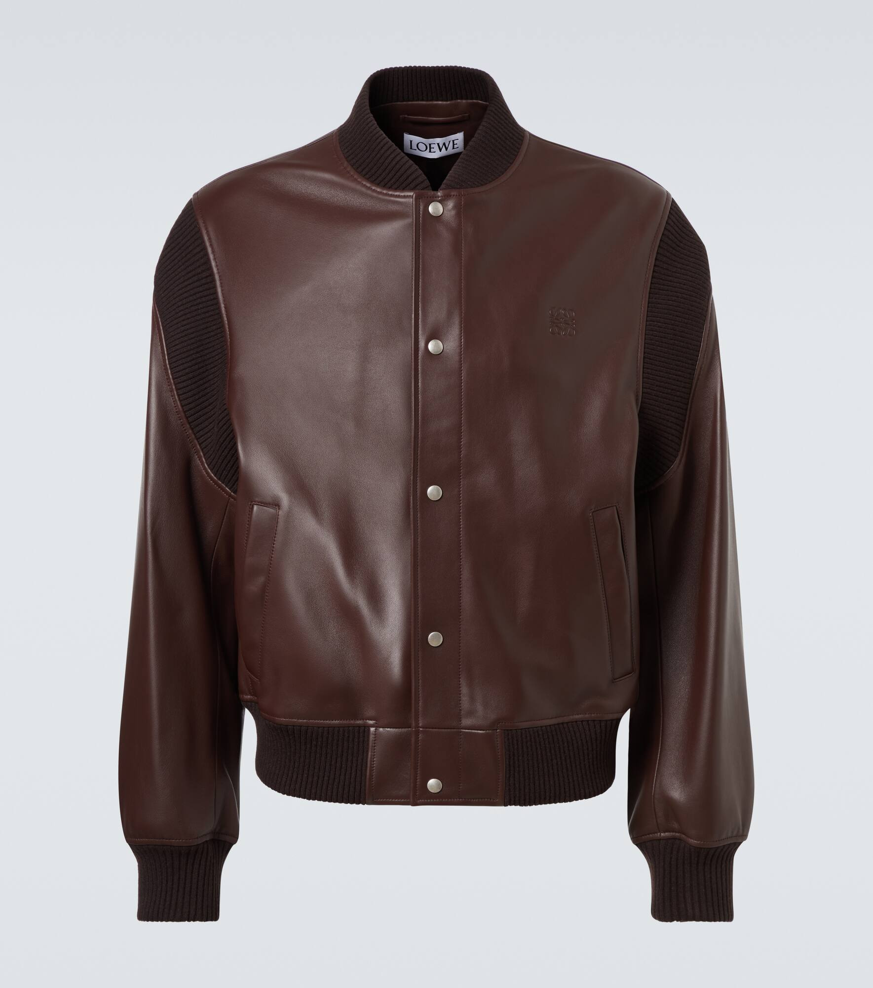 All of Loewe's leather goods are handcrafted in Spain, reflecting the house's centuries-long expertise and artisanal methods. This bomber jacket features a buttoned front and ribbed-knit cuffs, armholes, and hem for a comfortable fit. Product Details - Material: 100% lamb leather - Care instructions: specialist clean - Made in Italy - Designer color name: Chocolate Brown - Item color: brown - Cuff: ribbed, elasticated - Pockets: buttoned pockets - Closure: buttoned front - Hem: ribbed - Trim: 35% wool, 28% polyamide, 26% viscose, 9% cashmere, 2% elastane - Lining: 100% viscose - Sleeve lining: 100% viscose - Pocket lining: 100% cotton - Item number: P01063149 Size & Fit - True to size - Dropped shoulders - Designed for a loose fit - Elasticated hem - Non-stretchy fabric - Falls to the hip - Height of model is 189cm-74.5" and wears a size IT 50