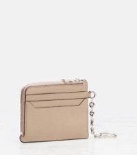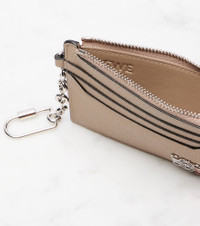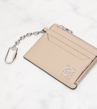 All of Loewe's leather goods are handcrafted in Spain, reflecting the house's centuries-long expertise and artisanal methods. Made from grain calfskin leather, this card holder is complete with a zipped pocket, a key chain, and silver-toned Anagram detailing. Product Details - Material: leather - Lining: leather - Made in Spain - Designer color name: Sand - Item color: beige - Contains non-textile parts of animal origin - Internal details: Card slots - Closure: zipped top - Hardware color: silver - Item number: P01076872 Size & Fit - Height 9cm-3.5" - Width 11cm-4.5" - Chain length 10,5cm-4"