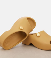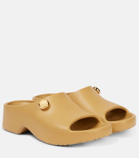 The Anagram logo was designed by the Spanish artist Vicente Vela as a quadruple-L insignia that now lends instant recognition to any Loewe piece. It's featured on these platform slides, embossed onto a gold-toned embellishment. Product Details - Upper: rubber - Lining: rubber - Sole: rubber insole and sole - Toe shape: round open toe - Made in Italy - Includes: shoe box, dust bags - Designer color name: Medium Concealer/Gold - Item color: beige - Hardware color: gold - Item number: P01057100 Size & Fit - True to size - Slightly wide at the back - Half sizes please take the next size up - European sizes - 5cm-2" heel (size EU 38) - 2,5cm-1" platform (size EU 38)