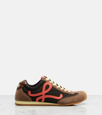 The Ballet Runner 2.0 sneakers from Loewe feature lightweight nylon uppers with smooth suede trims. They're accented with vibrant monograms on the sides and set on rubber soles. Product Details - Upper: calf leather (suede), fabric - Lining: leather - Sole: leather insole, rubber sole - Toe shape: round toe - Made in Italy - Includes: extra laces, dust bag, shoe box - Designer color name: Chocolate/Coral/Yellow - Item color: brown, orange - Closure: lace-up - Item number: P01118191 Size & Fit - True to size - Half sizes please take the next size down - European sizes - 2cm-1" wedge heel (size EU 38)