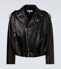 Founded in 1846 as a leathermaking company, Loewe maintains a commitment to art and craft of the utmost quality. Crafted from supple leather, the Balloon biker jacket features a charming bubble-shaped, cropped silhouette with a belted hem and asymmetric zipped front closure. Product Details - Material: 100% lamb leather - Care instructions: specialist clean - Made in Italy - Color: black - Designer color name: Black - Item color: black - Lining: 100% viscose - Filling: 45% polyester, 39% polyamide, 16% polyethylene - Pocket lining: 100% cotton - Closure: zipped front - Pockets: zipped pockets - Attached belt - Zipped cuffs - Includes: garment bag - Item number: P01123265 Size & Fit - True to size - Dropped shoulders - Designed for a loose fit - Adjustable hem - Non-stretchy fabric - Falls to the hip - Height of model is 189cm-74.5" and wears a size IT 48