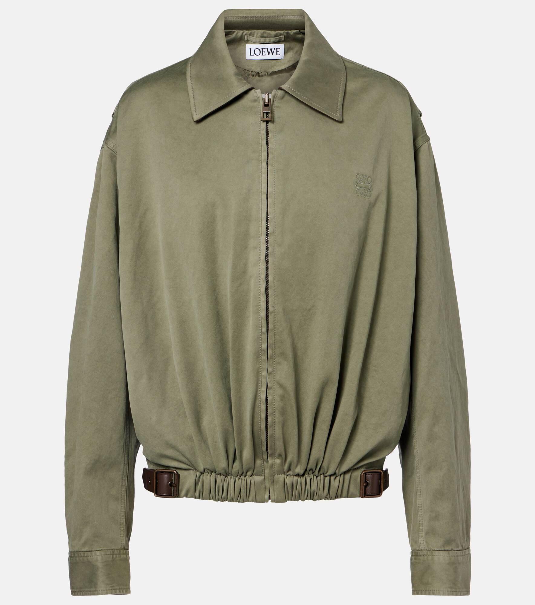 Founded in 1846 as a leathermaking company, Loewe maintains a commitment to art and craft of the utmost quality. This cotton satin blouson jacket is distinguished by leather buckle detailing at the waistband. Product Details - Material: 100% cotton - Care instructions: dry clean - Made in Italy - Designer color name: Khaki Green - Item color: green - Lining: 100% viscose - Details: 100% calf leather - Contains non-textile parts of animal origin - Collar: classic (Straight point) - Cuff: buttoned - Pockets: side slit pockets - Closure: zipped front - Item number: P01118240 Size & Fit - True to size - Dropped shoulders - Designed for a loose fit - Adjustable hem - Elasticated hem - Non-stretchy fabric - Falls below the hip - The model seen in the picture is 178cm-5'10" and wearing a size FR 46
