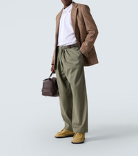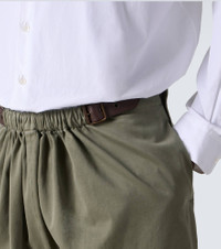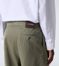 Founded in 1846 as a leathermaking company, Loewe maintains a commitment to art and craft of the utmost quality. Made in Italy from cotton, these pants are a straight-leg style with a gathered waistline adorned by a brown leather belt. Product Details - Material: 100% cotton - Care instructions: dry clean - Made in Italy - Designer color name: Khaki Green - Item color: green - Hardware color: bronze - Details: 100% calf leather - Pocket lining: 100% cotton - Contains non-textile parts of animal origin - Closure: zipped side - Attached belt - Pockets: back pocket, slant pockets - Item number: P01089574 Size & Fit - True to size - Adjustable at the waist - Non-stretchy fabric - Straight leg - Height of model is 189cm-74.5" and wears a size 50
