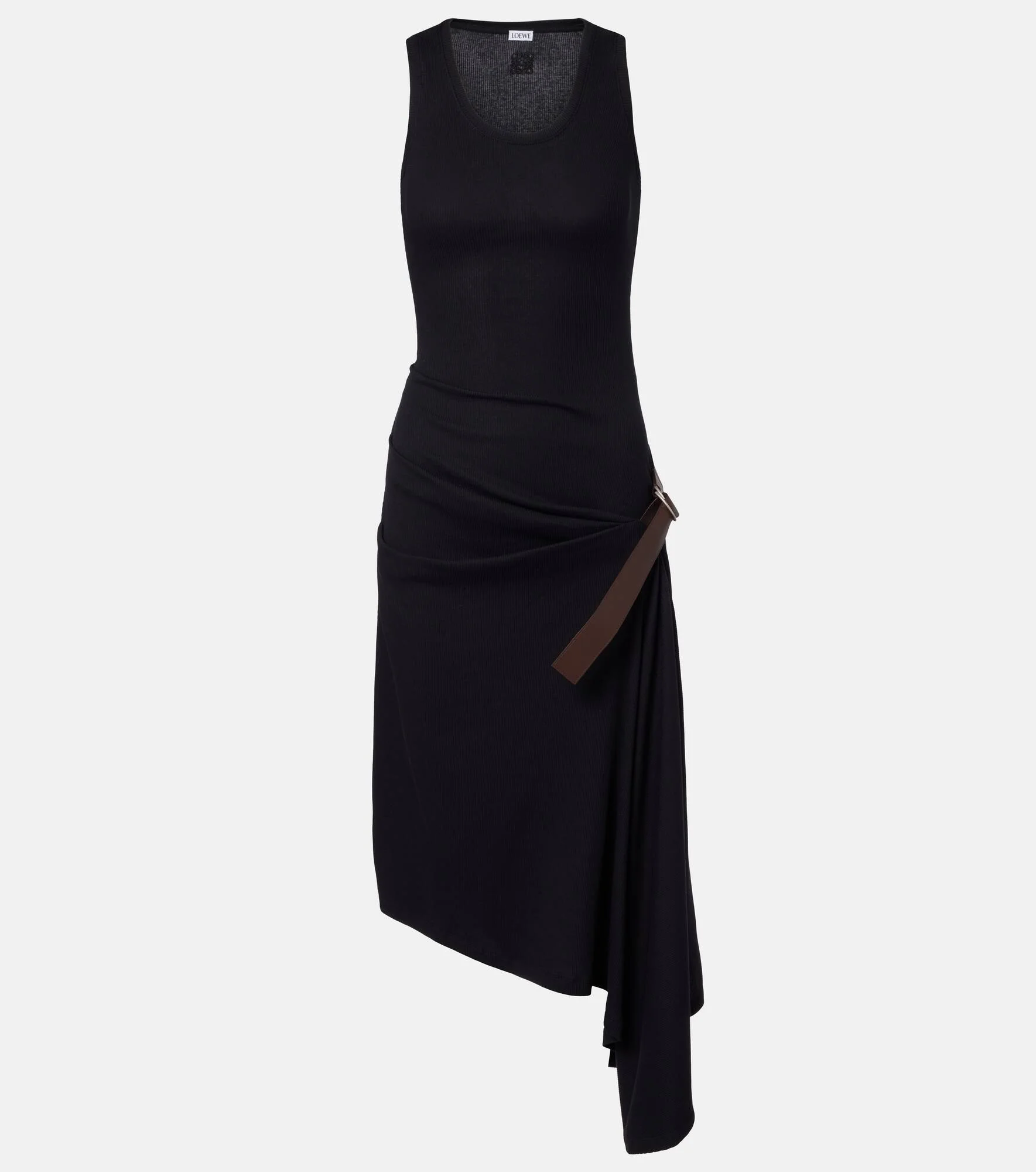 Founded in 1846 as a leathermaking company, Loewe maintains a commitment to art and craft of the utmost quality. Ribbed-knitted from a cotton blend, this midi dress boasts a leather belt detail and elegant draping that creates an asymmetric hemline. Product Details - Material: 97% cotton, 3% elastane - Care instructions: specialist clean - Made in Portugal - Color: black - Designer color name: Black - Details: 100% calf leather - Trim: 100% polyester - Contains non-textile parts of animal origin - Item number: P01118174 Size & Fit - True to size - Relaxed fit from the hip down - Stretchy fabric - The model seen in the picture is 178cm-5'10" and wearing a size XS