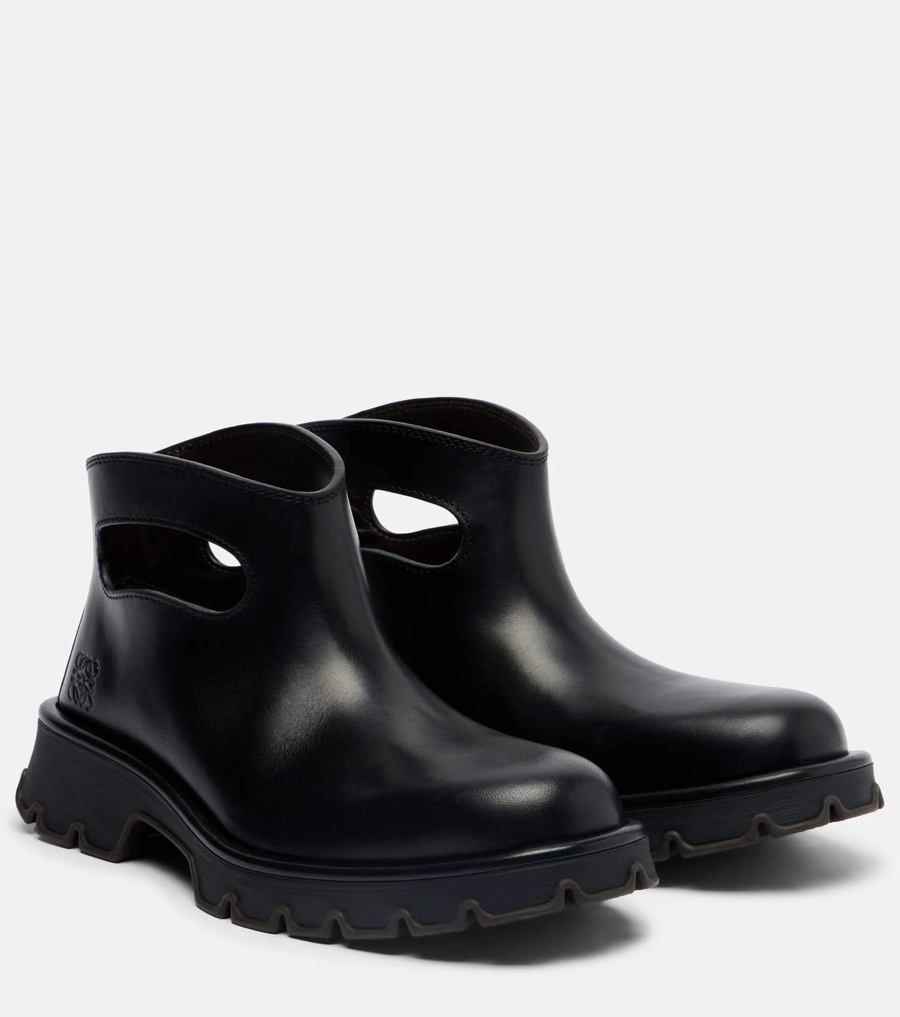 Founded in 1846 as a leathermaking company, Loewe maintains a commitment to art and craft of the utmost quality. The Bobby leather ankle boots feature striking handle cutouts, lugged soles, and tonal Anagram detailing. Product Details - Upper: calf leather - Lining: leather - Sole: leather insole, rubber sole - Toe shape: round toe - Made in Italy - Includes: shoe box, dust bag - Designer color name: Black - Item color: black - Item number: P01118185 Size & Fit - True to size - European sizes - 4cm-1.5" heel - 3cm-1" platform