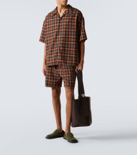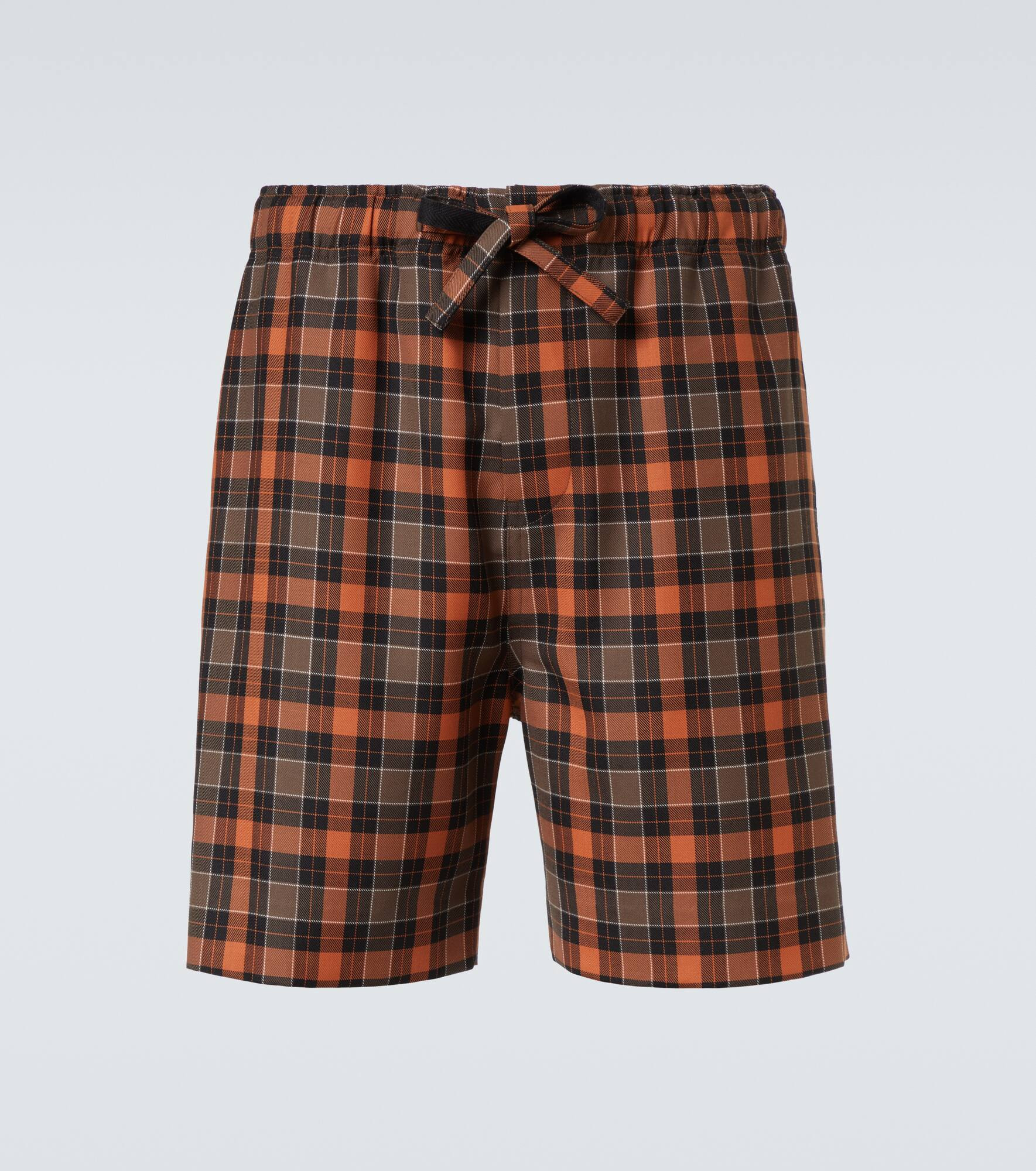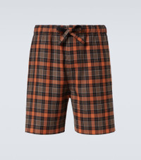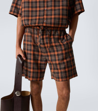 Founded in 1846 as a leathermaking company, Loewe maintains a commitment to art and craft with the utmost quality. These Bermuda shorts showcase a classic checked pattern and feature a leather logo patch at the back. Product Details - Material: 55% polyester, 45% wool - Care instructions: dry clean - Made in Italy - Designer color name: Orange/Black - Item color: orange, black - Embroidery: 100% polyester - Details: 100% calf leather - Lining: 100% cotton - Contains non-textile parts of animal origin - Closure: zipper fly, button fastening - Elasticated drawstring waist - Pockets: side slit pockets, back pocket - Item number: P01063188 Size & Fit - True to size - Elasticated waist - Adjustable at the waist - Non-stretchy fabric - Straight leg - Height of model is 188cm-74" and wears a size L