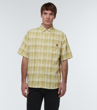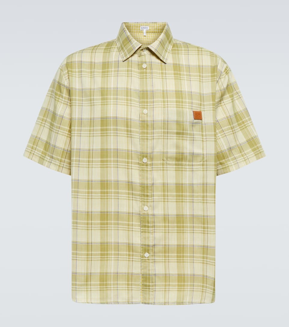 This short-sleeved shirt from Loewe is made from lightweight gauze with a checked pattern. This style has a regular fit and the trompe d'oeil chest pocket is complete with an Anagram logo leather tab. - material: 65% polyester, 35% cotton - details: 100% calf leather - care instructions: dry clean - breast pocket - buttoned front - Made in Italy - contains non-textile parts of animal origin - Designer colour name: Green/Yellow size & fit - True to size - Without pleats in the back - Designed for a loose fit - Lightweight material - Falls to the hip - The model in the picture is 185cm-6'1" and wearing a size EU 38