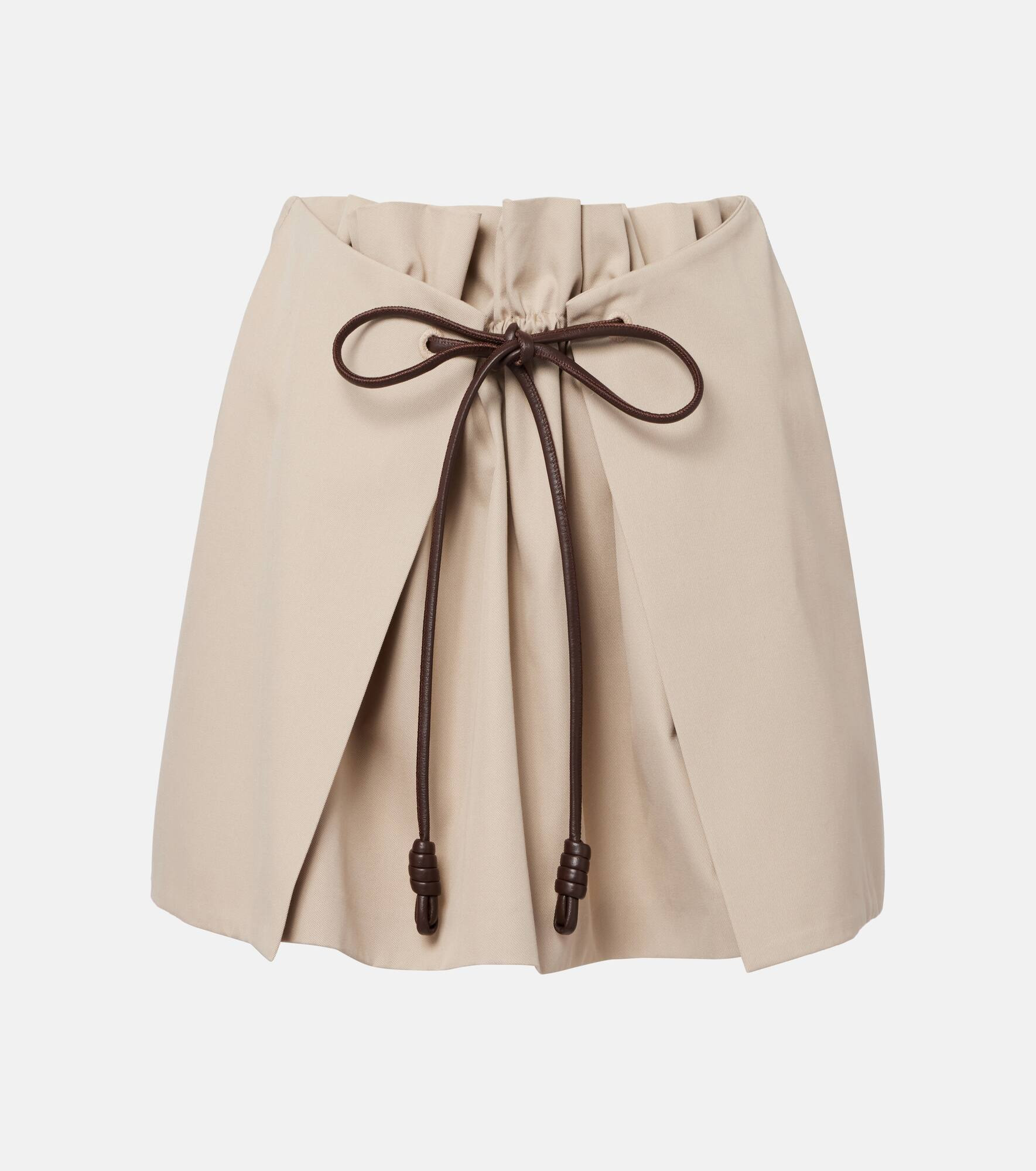 This Loewe miniskirt elevates a simple silhouette with distinctive details. Made from lightweight cotton and silk gabardine, this style features a pleated front with a Flamenco-inspired drawstring. Product Details - Material: 90% cotton, 10% silk - Care instructions: dry clean - Made in Italy - Designer color name: Dark Beige - Item color: beige, brown - Trim: 100% leather - Contains non-textile parts of animal origin - Elasticated waistband - Item number: P01066179 Size & Fit - True to size - Elasticated waist - Non-stretchy fabric - Sits low on the hips - Height of model is 174cm-68.5" and wears a size FR 34