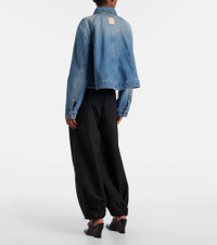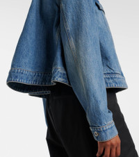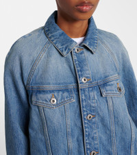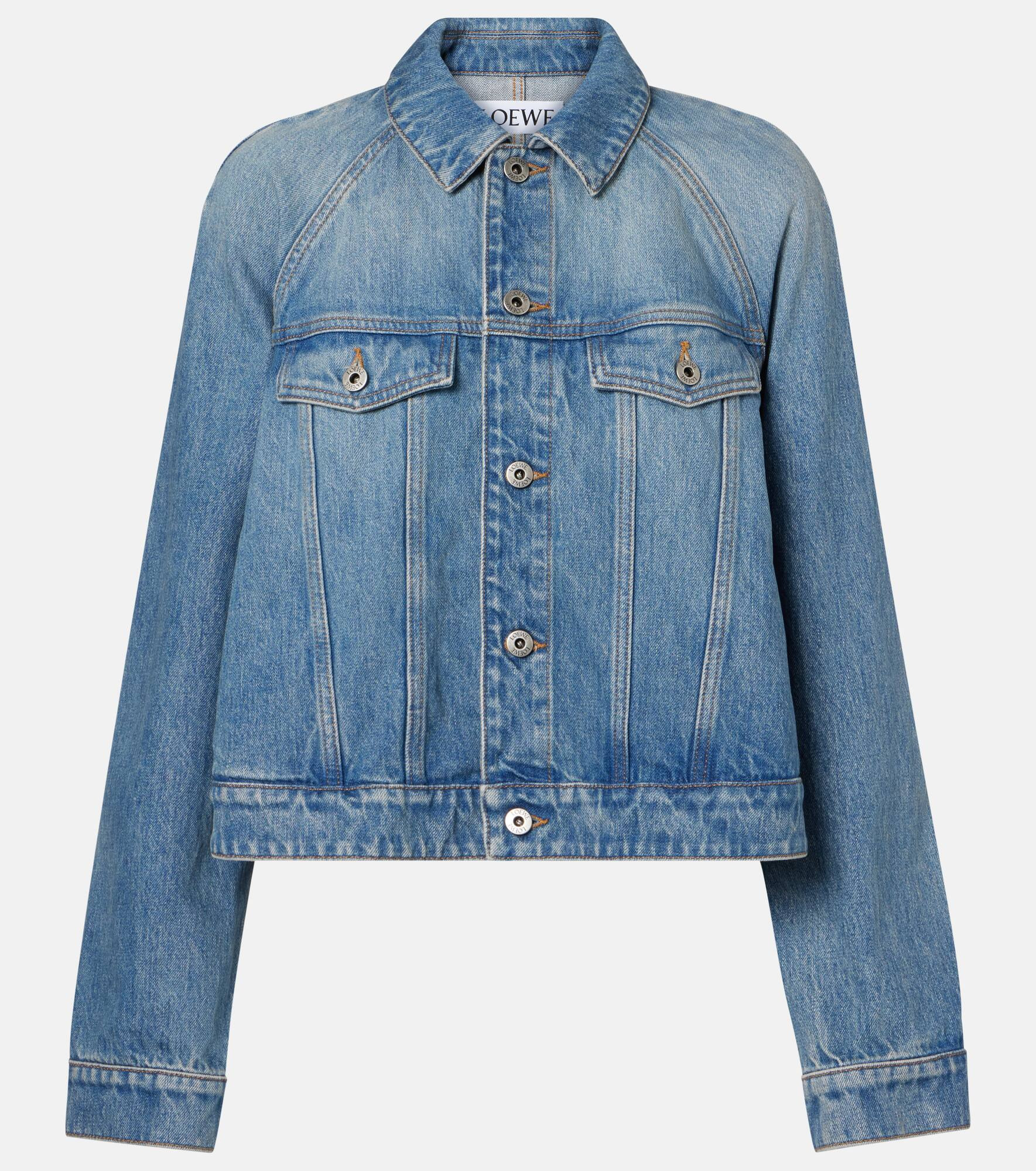 Founded in 1846 as a leathermaking company, Loewe maintains a commitment to art and craft of the utmost quality. This denim jacket is shaped with a cropped, trapeze silhouette and brings a vintage aesthetic with its washed finish. Product Details - Material: 100% cotton - Care instructions: dry clean - Made in Italy - Designer color name: Denim Blue - Item color: blue - Details: 100% leather - Closure: buttoned front - Cuff: buttoned - Pockets: flap chest pockets - Pocket lining: 65% polyester, 35% cotton - Oversized fit - Contains non-textile parts of animal origin - Item number: P01066244 Size & Fit - True to size - Designed for a loose fit - Non-stretchy fabric - Falls to the hip - The model seen in the picture is 178cm-5'10" and wearing a size FR 34