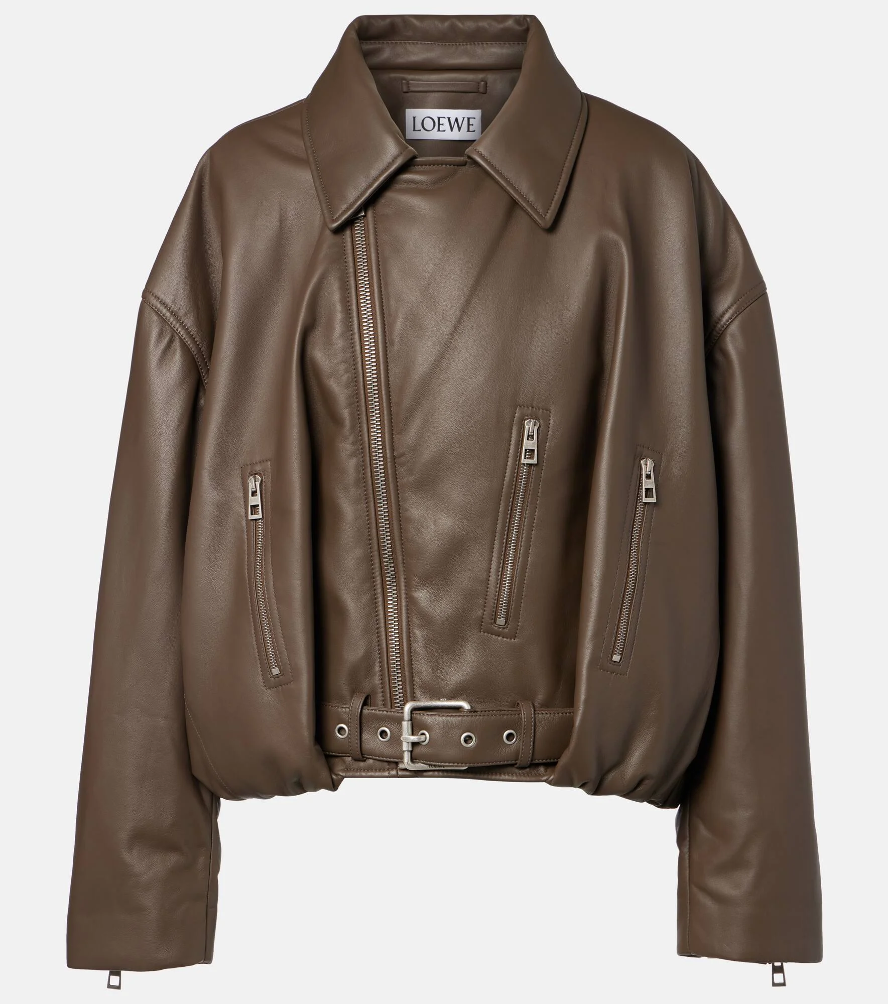 This Loewe piece is crafted in Italy, reflecting the house's centuries-long expertise and artisanal methods. This biker jacket is cut from lamb leather to a cropped silhouette with a cinching belt at the waist. Product Details - Material: 100% lamb leather - Care instructions: specialist clean - Made in Italy - Designer color name: Khaki Green - Item color: green - Lining: 100% viscose - Filling: 45% polyester, 39% polyamide, 16% polyethylene - Pocket lining: 100% cotton - Hardware color: silver - Closure: zipped front - Attached belt - Pockets: zipped pockets, welt pocket - Cuff: zipped - Includes: garment bag - Item number: P01118198 Size & Fit - True to size - Dropped shoulders - Designed for a loose fit - Adjustable hem - Non-stretchy fabric - Falls to the hip - Height of model is 175cm-69" and wears a size FR 34
