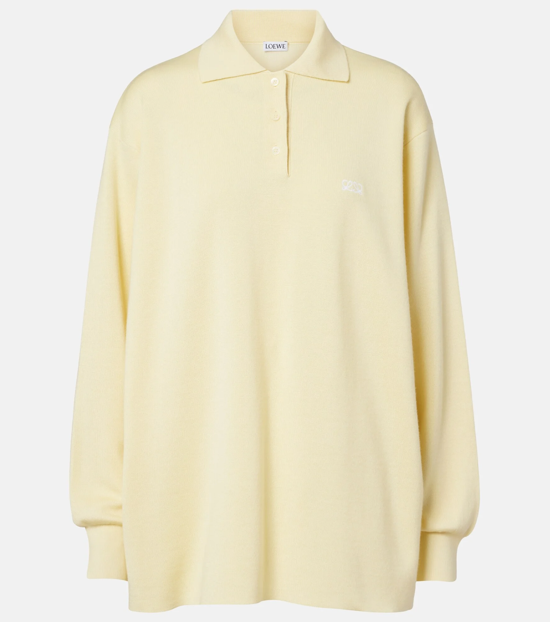Founded in 1846 as a leathermaking company, Loewe maintains a commitment to art and craft of the utmost quality. This sweater is a polo style knitted from a cashmere and silk blend and complete with Double L embroidery at the chest. Product Details - Material: 67% cashmere, 28% silk, 4% polyamide, 1% elastane - Care instructions: dry clean - Made in Italy - Color: yellow - Designer color name: Light Yellow - Trim: 100% polyester - Collar: polo collar - Contains non-textile parts of animal origin - Item number: P01166359 Size & Fit - True to size - Dropped shoulders - Oversized - Falls below the hip - Height of model is 174cm-68.5" and wears a size XS