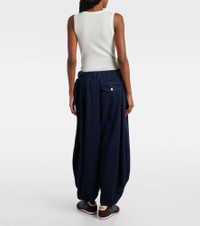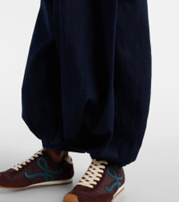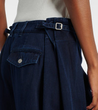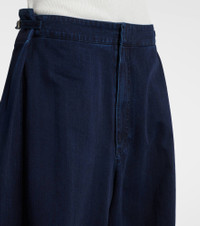 Founded in 1846 as a leathermaking company, Loewe maintains a commitment to art and craft of the utmost quality. Made from dark-washed denim, these wide-leg jeans feature draped detailing for a voluminous silhouette. Product Details - Material: 100% cotton - Care instructions: machine wash at 30 degrees - Made in Italy - Designer color name: Dark Indigo - Item color: blue - Lining: 65% polyester, 35% cotton - Contains non-textile parts of animal origin - Hardware color: silver - Closure: zip, hook, and button fastening - Adjustable tabs at the waist - Pockets: side slit pockets, back pocket - Belt loops - Fit: wide-leg - Item number: P01104983 Size & Fit - True to size - Adjustable at the waist - Non-stretchy fabric - Wide-leg - High-waisted - The model seen in the picture is 178cm-5'10" and wearing a size FR 34