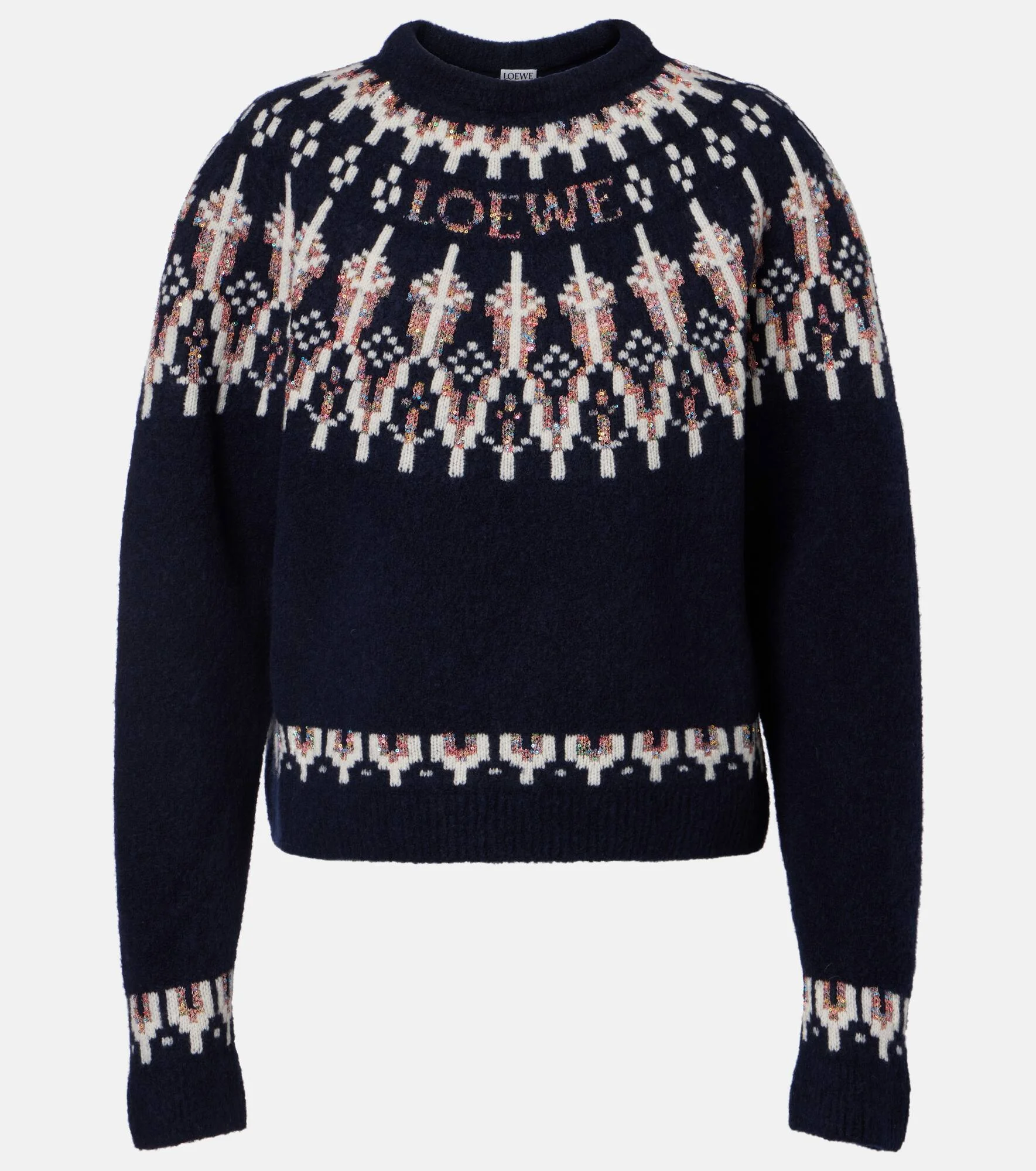 Founded in 1846 as a leathermaking company, Loewe maintains a commitment to art and craft of the utmost quality. Made from wool-blend fabric with a Fair Isle jacquard pattern, this sweater has a boxy silhouette with ribbed-knit trims. Product Details - Material: 64% wool, 35% polyamide, 1% elastane - Care instructions: dry clean - Made in Italy - Designer color name: Navy/Multicolor - Item color: blue, multicolor - Collar: crewneck - Cuff: ribbed - Hem: ribbed - Item number: P01118205 Size & Fit - True to size - Straight fit - Falls to the hip - The model seen in the picture is 178cm-5'10" and wearing a size XS