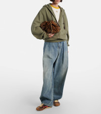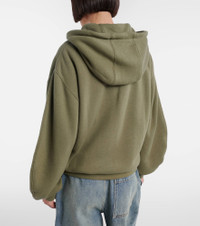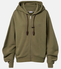 This Flamenco zip-up hoodie from Loewe is defined by signature knotted drawstrings crafted from soft leather. The design is made from a blend of cotton and cashmere, and finished with distinctive curved sleeves. Product Details - Material: 95% cotton, 5% cashmere - Care instructions: dry clean - Made in Portugal - Color: green - Designer color name: Khaki Green - Item color: green - Material II: 86% cotton, 10% cashmere, 4% elastane - Embroidery: 100% polyester - Details: 100% calf leather - Contains non-textile parts of animal origin - Drawstring hood - Cuff: ribbed - Closure: zipped front - Hem: ribbed - Item number: P01118202 Size & Fit - True to size - Dropped shoulders - Designed for a loose fit - Stretchy fabric - Falls to the hip - The model seen in the picture is 178cm-5'10" and wearing a size XS