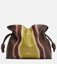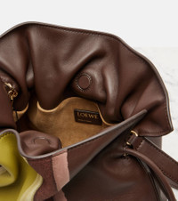 Crafted from leather, the Flamenco Landscape shoulder bag by Loewe is lined with suede and showcases the signature knot drawstrings. This design features an adjustable shoulder strap. Product Details - Material: calf leather - Lining: suede - Made in Spain - Designer color name: Chocolate/Light Moss - Item color: brown, green - Detachable, adjustable shoulder strap - Includes: dust bag - Item number: P01065715 Size & Fit - Height 24cm-9.5" - Width 29.5cm-11.5" - Depth 9cm-3.5" - Adjustable shoulder strap - Max. length shoulder strap 121cm-47.5"
