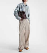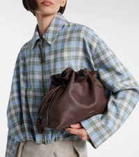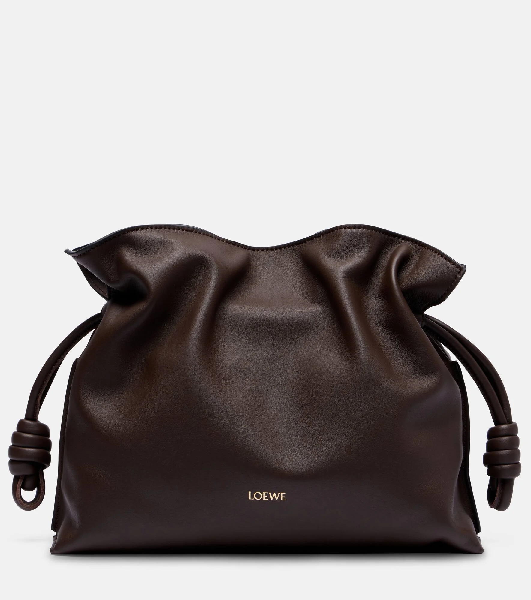 The Flamenco Medium leather clutch features a drawstring closure and a detachable shoulder strap. All of Loewe's leather goods are handcrafted in Spain, reflecting the house's centuries-long expertise and artisanal methods. Product Details - Material: calf leather - Lining: calf leather - Made in Spain - Designer color name: Chocolate - Item color: brown - Hardware color: gold - Closure: magnetic fastening, drawstring top - Detachable, adjustable shoulder strap - Item number: P01095643 Size & Fit - Height 24cm-9.5" - Min. width 30cm-12" - Max. width 34cm-13.5" - Max. depth 10cm-4" - Adjustable shoulder strap - Min. length shoulder strap 99cm-39" - Max. length shoulder strap 122cm-48"
