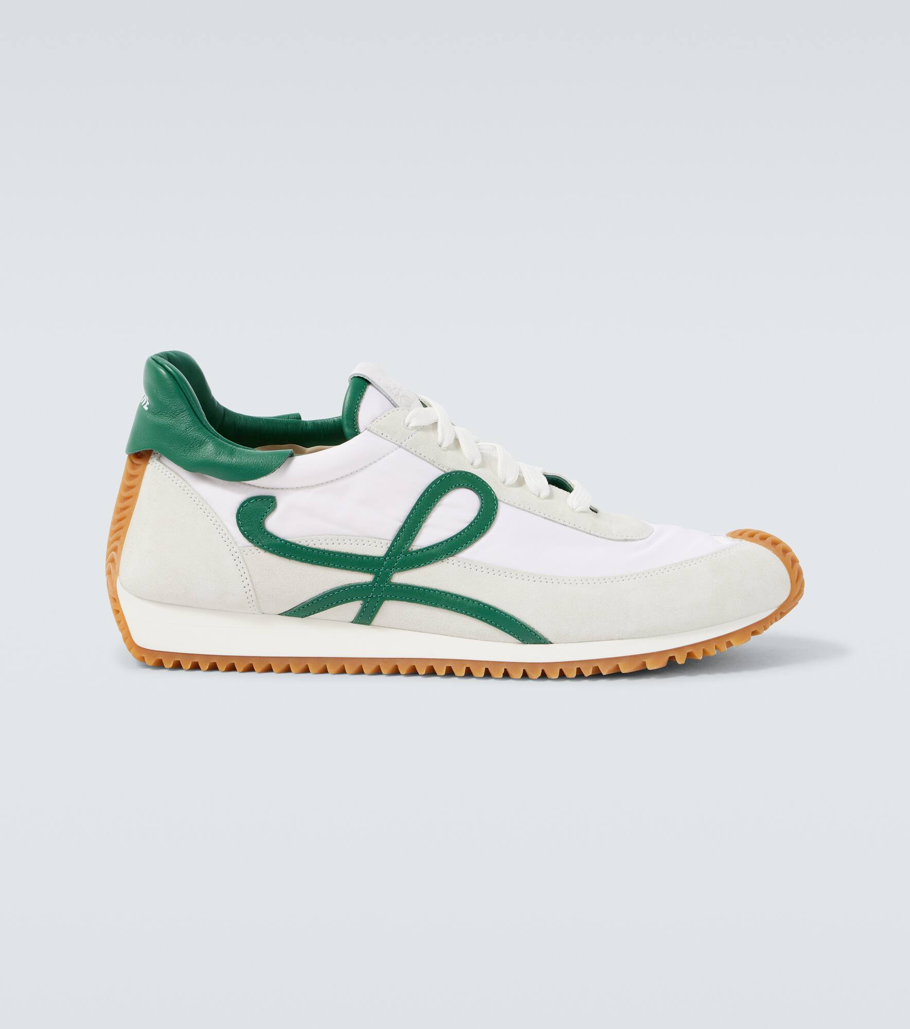 Founded in 1846, Loewe maintains a commitment to art and craft of the utmost quality. The Flow Runner 2.0 sneakers feature fabric uppers with suede trims and showcase the brand's L monogram on the sides, creating a fun color contrast. Product Details - Upper: fabric, leather (suede) - Lining: fabric, leather - Sole: leather insole, rubber sole - Toe shape: almond toe - Made in Italy - Includes: dust bag, shoe box - Designer color name: White/DarkGreen - Item color: white, green - Item number: P01063252 Size & Fit - True to size - Half sizes please take the next size down - European sizes