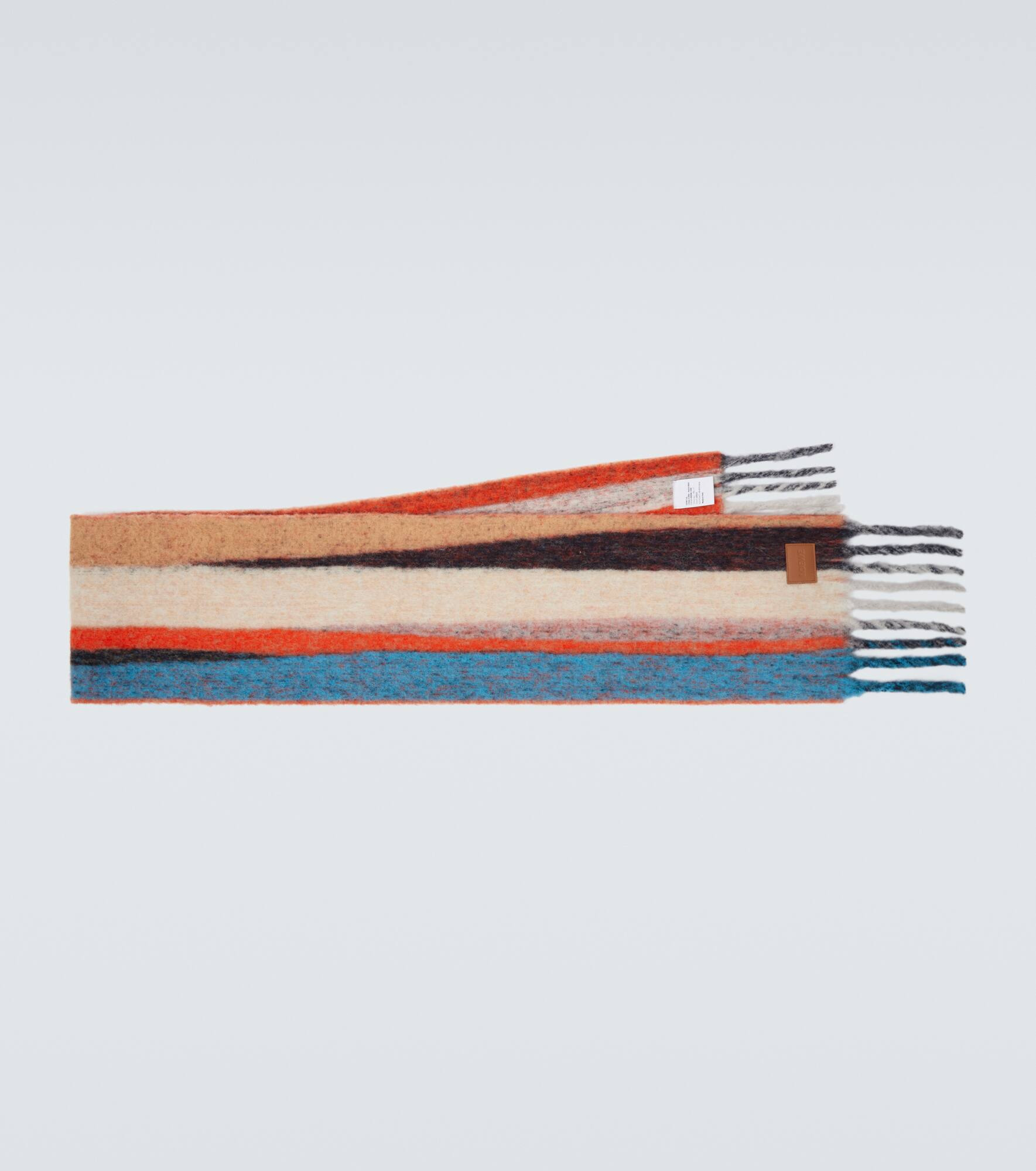 Founded in 1846 as a leathermaking company, Loewe maintains a commitment to art and craft of the utmost quality. Made from a plush fabric with alpaca, this scarf is a striped piece with a logo-debossed leather patch and fringed trims. Product Details - Material: 73% alpaca wool, 18% polyamide, 9% wool - Care instructions: dry clean - Made in Italy - Designer color name: Orange/Blue - Item color: multicolor - Contains non-textile parts of animal origin - Item number: P01063410 Size & Fit - Length 185cm-73" - Width 24cm-9.5" - Length of fringe 15cm-6"