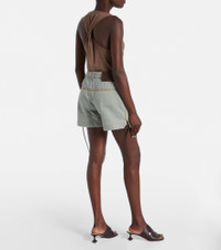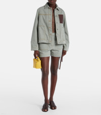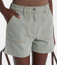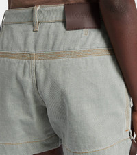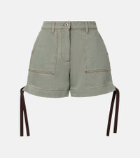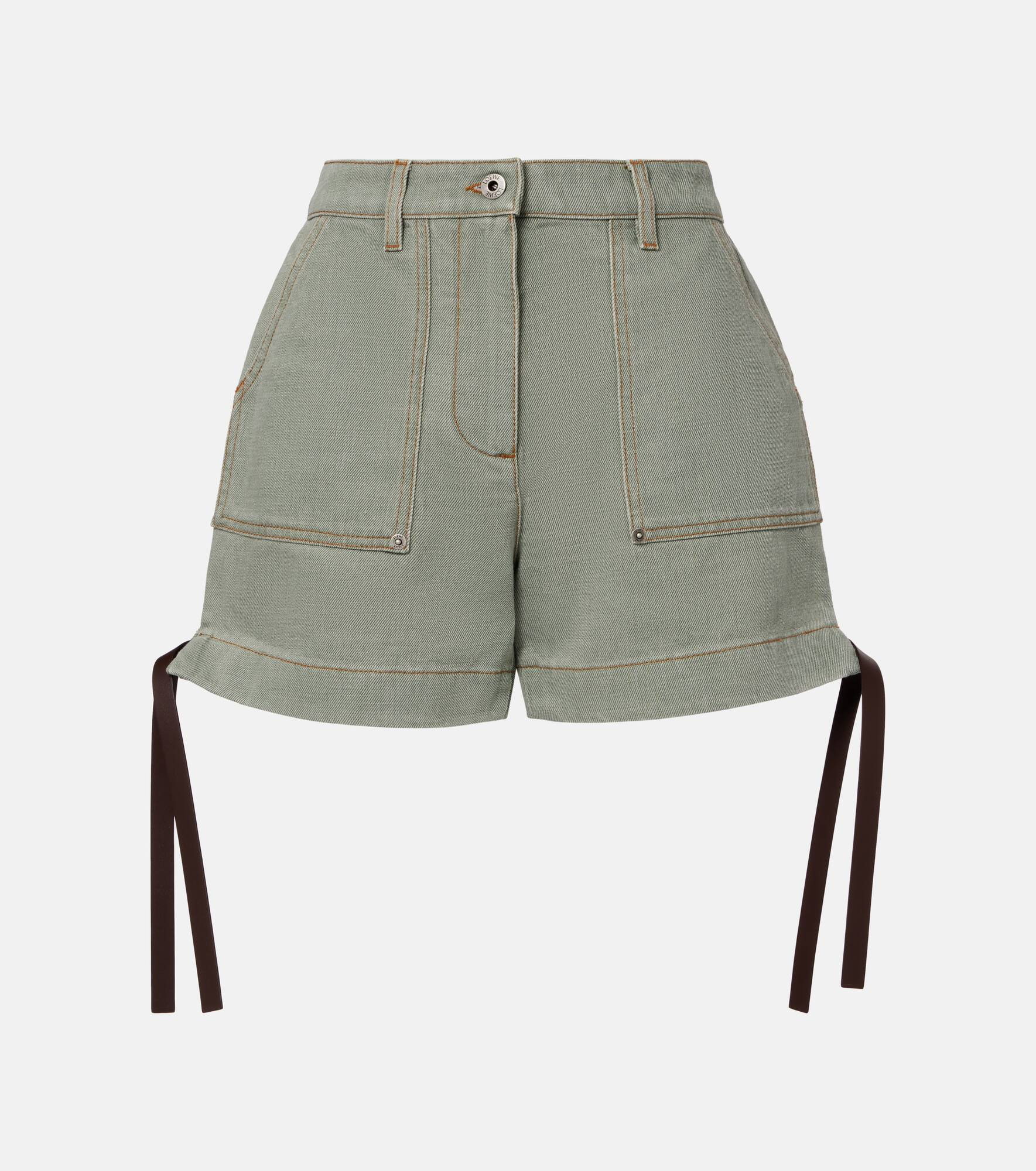 These high-rise shorts by Loewe are crafted in Italy from cotton, blending utilitarian edge with refined tailoring. Inspired by classic workwear, the design features slant pockets, self-tie side details, and a zip-button closure. Product Details - Material: 100% cotton - Care instructions: dry clean - Made in Italy - Designer color name: Khaki Green - Item color: green, brown - Details: 100% lamb leather - Lining: 65% polyester, 35% cotton - Contains non-textile parts of animal origin - Hardware color: antique silver - Closure: zip and button fastening - Belt loops - Pockets: slant pockets - Self-tie sides - High-rise - Item number: P01066224 Size & Fit - True to size - Non-stretchy fabric - Wide-leg - The model seen in the picture is 178cm-5'10" and wearing a size FR 34