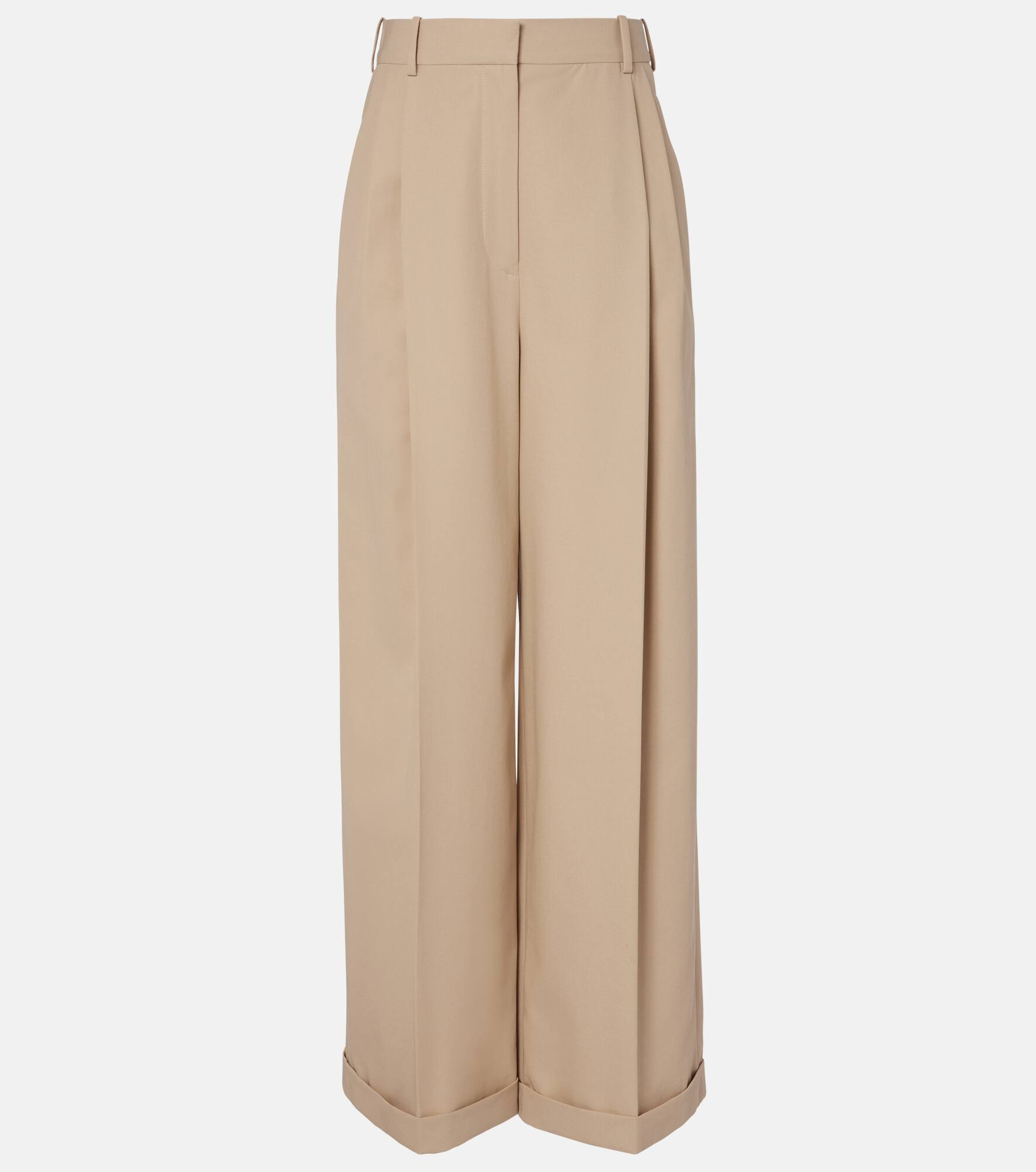 These wide-leg pants from Loewe strike the perfect balance between elegance and ease. Crafted from crisp cotton, the beige pair is defined by a pleated, slightly flared silhouette. Product Details - Material: 100% cotton - Care instructions: dry clean - Made in Italy - Designer color name: Beige - Item color: beige - Embroidery: 100% polyester - Lining: 70% cotton, 30% polyester - Pocket lining: 100% cotton - Contains non-textile parts of animal origin - Closure: zipper fly, button and hook fastenings - Belt loops - Hem: cuffed - Item number: P01104969 Size & Fit - Fits small to size - we recommend trying one size larger - Non-stretchy fabric - Wide-leg - High-waisted - The model seen in the picture is 178cm-5'10" and wearing a size FR 32