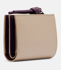 All of Loewe's leather goods are handcrafted in Spain, reflecting the house's centuries-long expertise and artisanal methods. The Knot bi-color wallet features six card slots, a zipped coin compartment, embossed logo detailing, and the namesake zip pull. Product Details - Material: calf leather - Lining: leather - Made in Spain - Designer color name: Clay/Plum - Item color: beige, burgundy - Internal details: bill slot, Card slots, zipped coin pocket - Closure: snap-buttoned fastening - Includes: dust bag, box - Item number: P01117843 Size & Fit - Height 8.5cm-3.5" - Width 11.5cm-4.5" - Depth 2.5cm-1"
