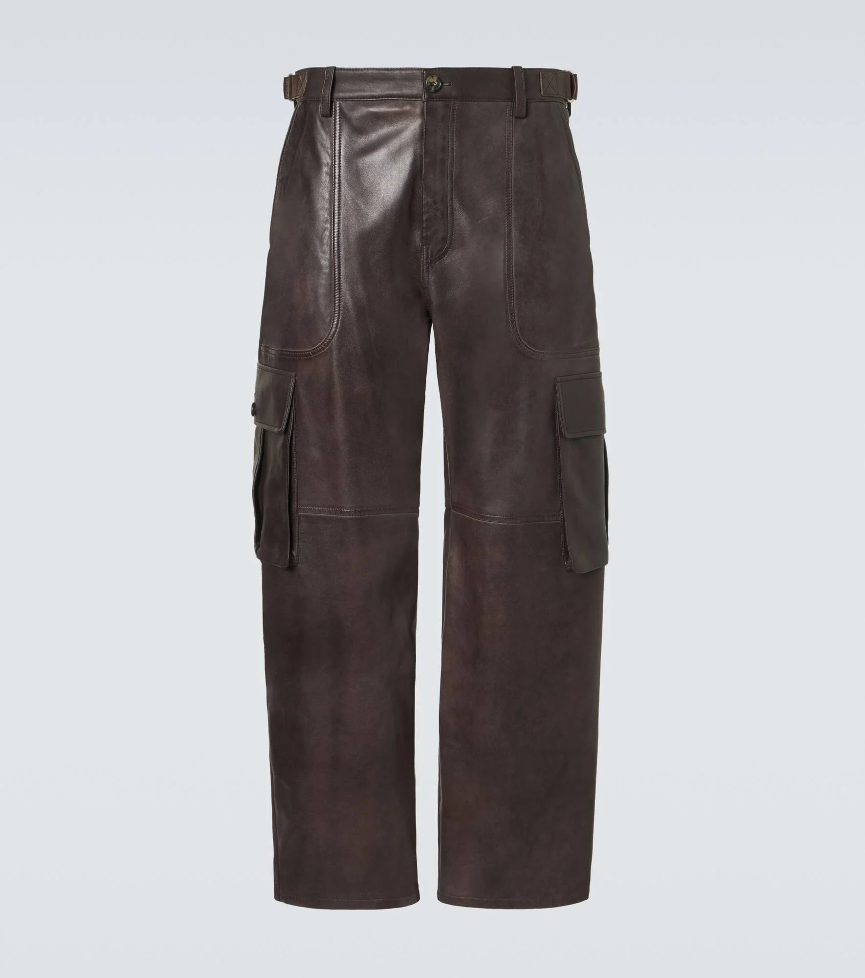 Founded in 1846 as a leathermaking company, Loewe maintains a commitment to art and craft of the utmost quality. Carefully crafted in Italy from dark brown leather, these pants are a classic cargo-inspired style with a wide-leg silhouette. Product Details - Material: 100% lamb leather - Care instructions: specialist clean - Made in Italy - Color: brown - Designer color name: Brown - Material II: 100% cotton - Pocket lining: 100% cotton - Lining: 100% viscose - Details: 100% lamb leather - Belt loops - Adjustable tabs at the waist - Pockets: slant pockets, back pocket, cargo pockets - Closure: zipper fly, button fastening - Item number: P01123332 Size & Fit - True to size - Adjustable at the waist - Non-stretchy fabric - Wide-leg - Height of model is 189cm-74.5" and wears a size 50