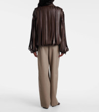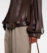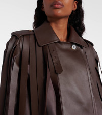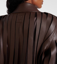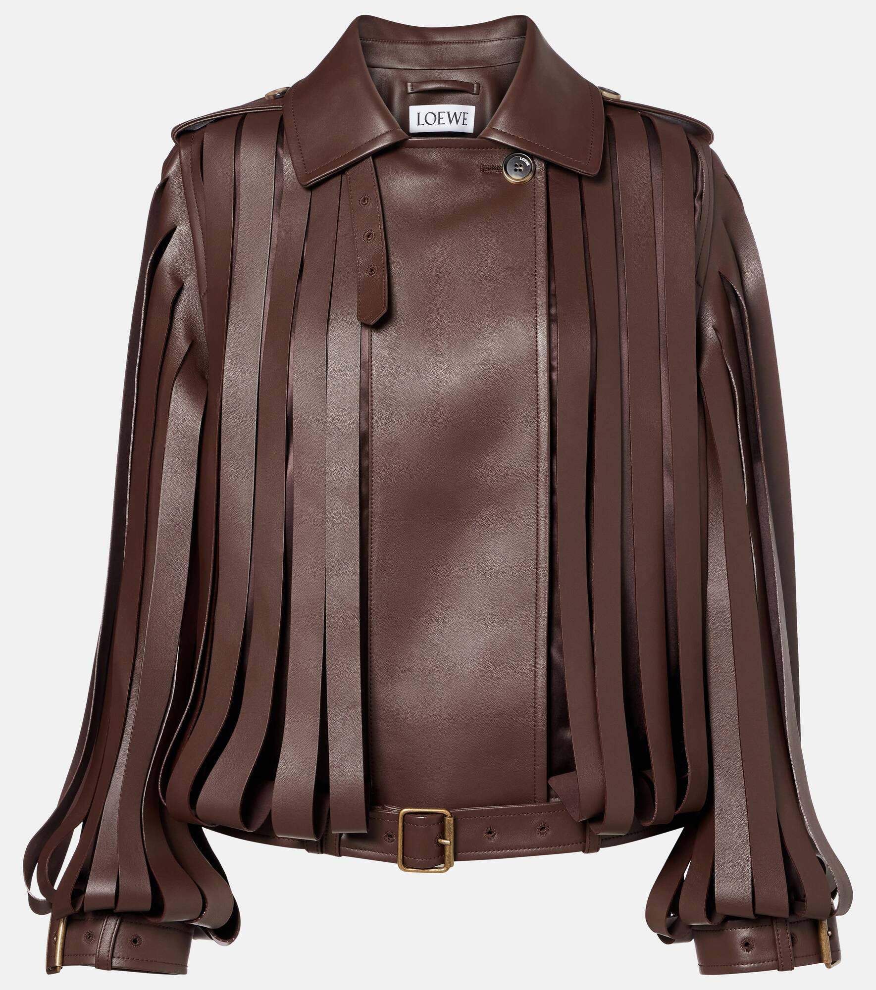Founded in 1846 as a leathermaking company, Loewe maintains a commitment to art and craft of the utmost quality. The leather jacket has a concealed buttoned front and is finished with side slit pockets. Product Details - Material: 100% lamb leather - Care instructions: specialist clean - Made in Spain - Designer color name: Brown - Item color: brown - Lining: 100% silk - Lining II: 100% viscose - Hardware color: bronze - Closure: concealed buttoned front - Pockets: side slit pockets - Item number: P01104998 Size & Fit - True to size - Designed for a loose fit - Non-stretchy fabric - Falls to the hip - Height of model is 174cm-68.5" and wears a size FR 34