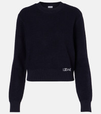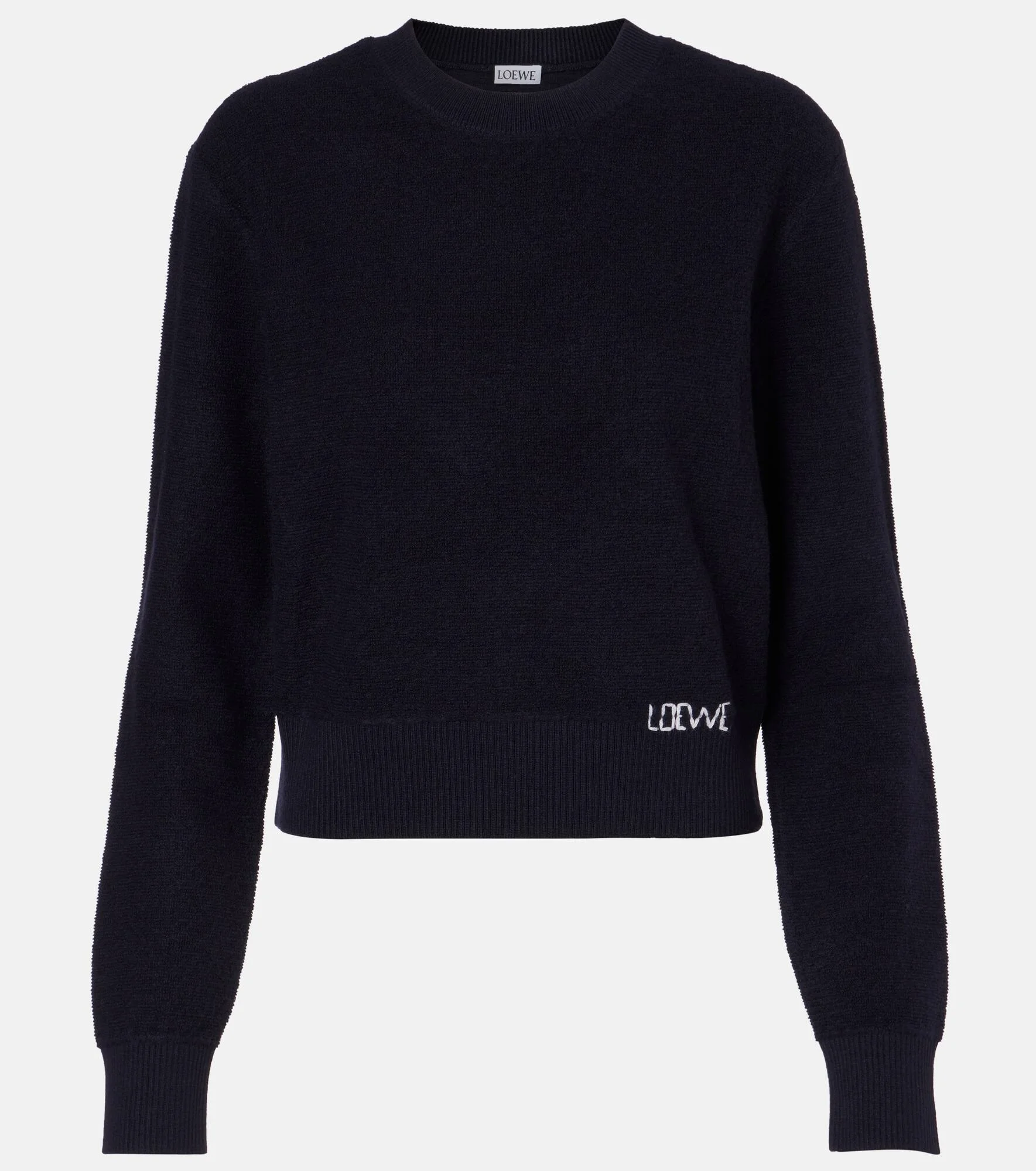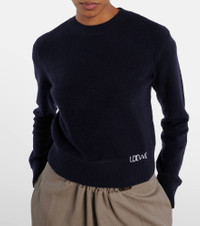This sweater from Loewe is made of soft wool and finished with ribbed-knit details along the neck, hem, and cuffs. The design is decorated with contrast logo embroidery above the hem. Product Details - Material: 100% wool - Care instructions: dry clean - Made in Italy - Designer color name: Navy Blue - Item color: blue - Trim: 50% acrylic, 50% wool - Collar: crewneck - Cuff: ribbed - Hem: ribbed - Item number: P01117654 Size & Fit - True to size - Straight fit - Slightly stretchy fabric - Falls to the hip - The model seen in the picture is 178cm-5'10" and wearing a size XS