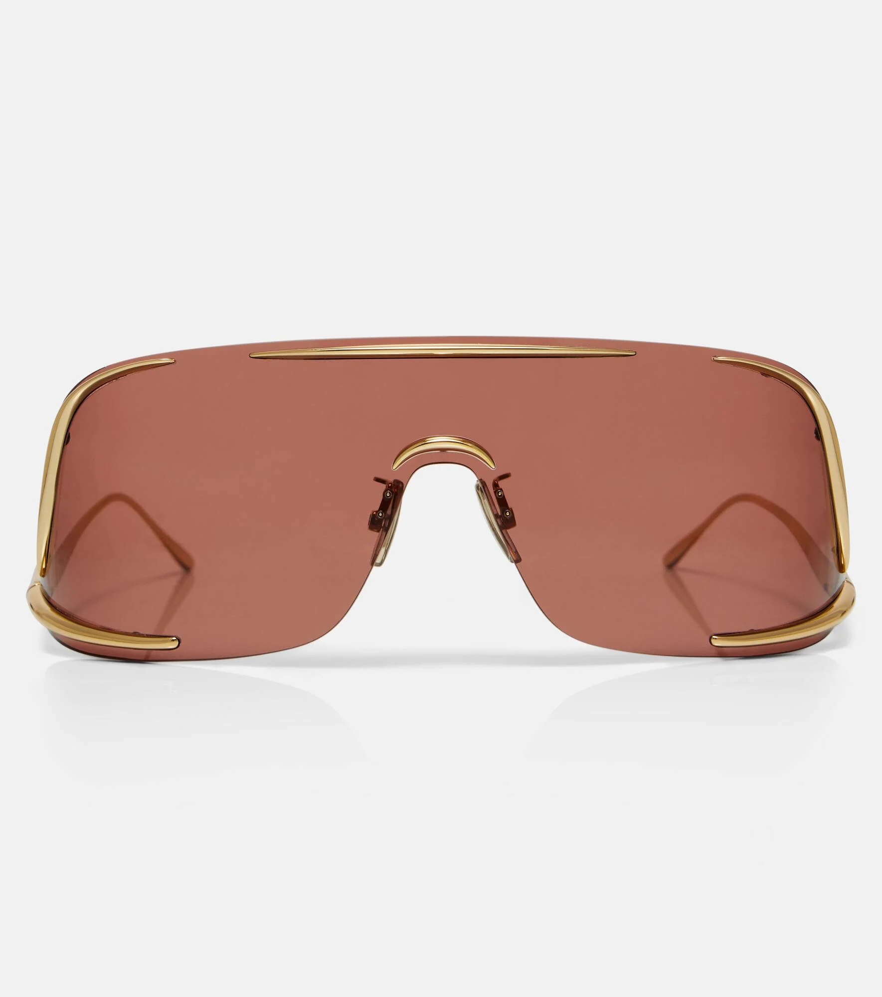 Founded in 1846 as a leathermaking company, Loewe maintains a commitment to art and craft of the utmost quality. These shield sunglasses are finished with branded hardware and low-set temples. Product Details - Frame material: metal - Frame color: gold - Lens filter category 2 - Color: red - Lens color: red - Made in Italy - Includes: case and presentation box, cleaning cloth - The color of the case may vary - Item number: P01098172 Size & Fit - Lens width: 170mm-6.7" - Earpiece length: 120mm-4.7"